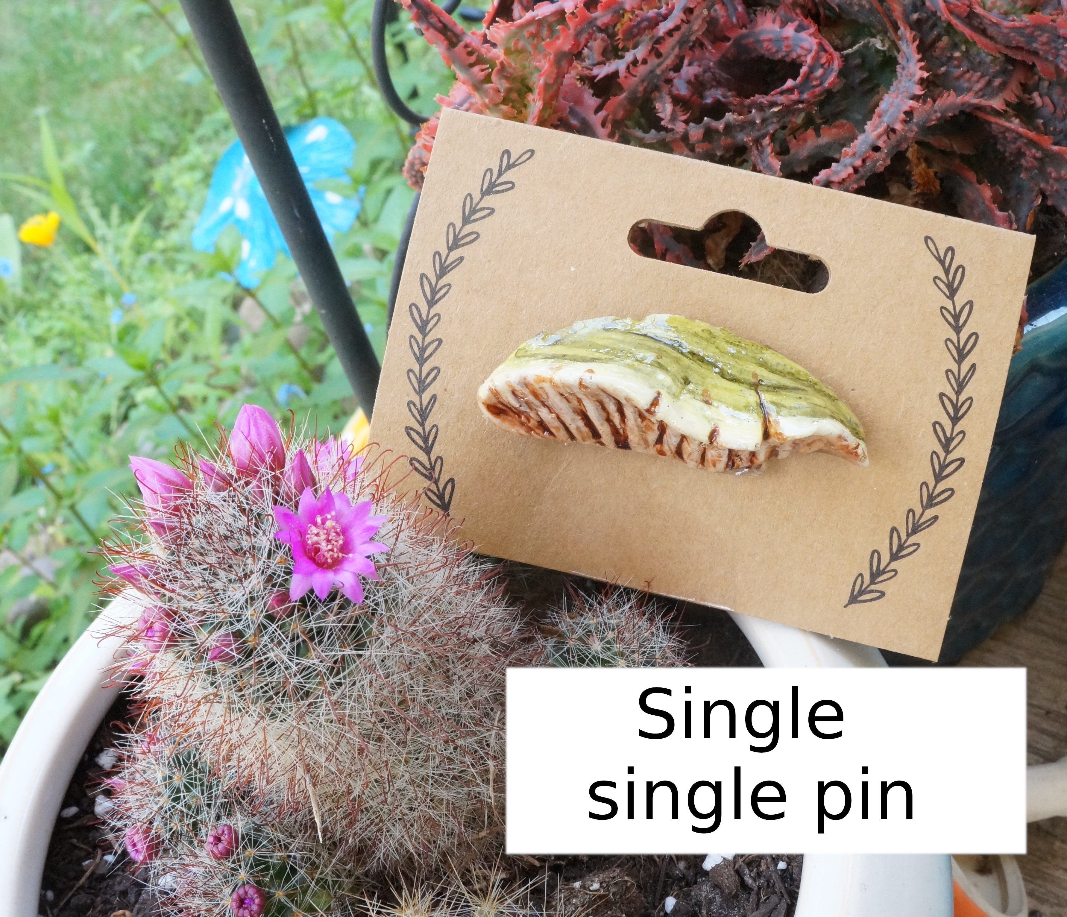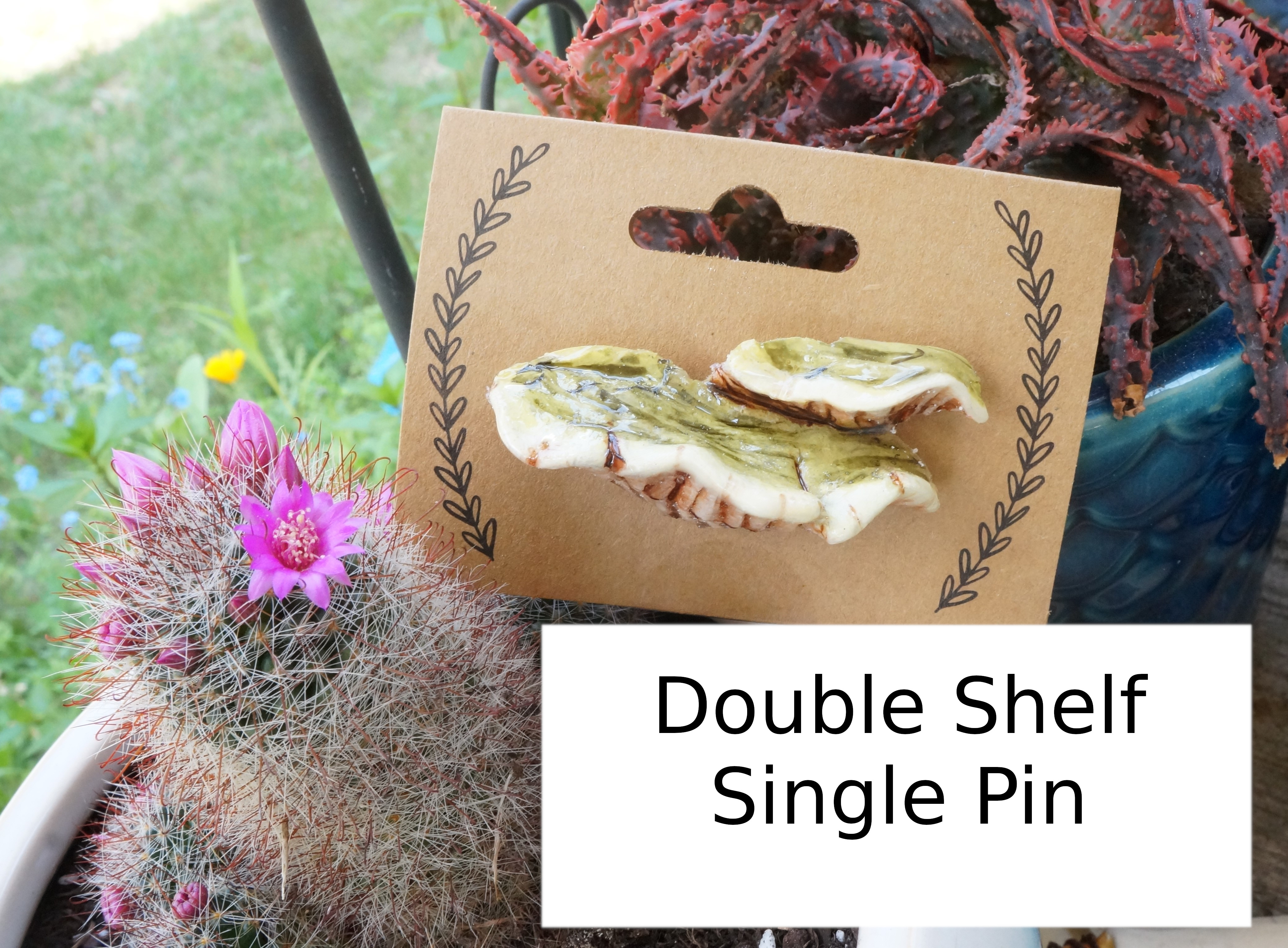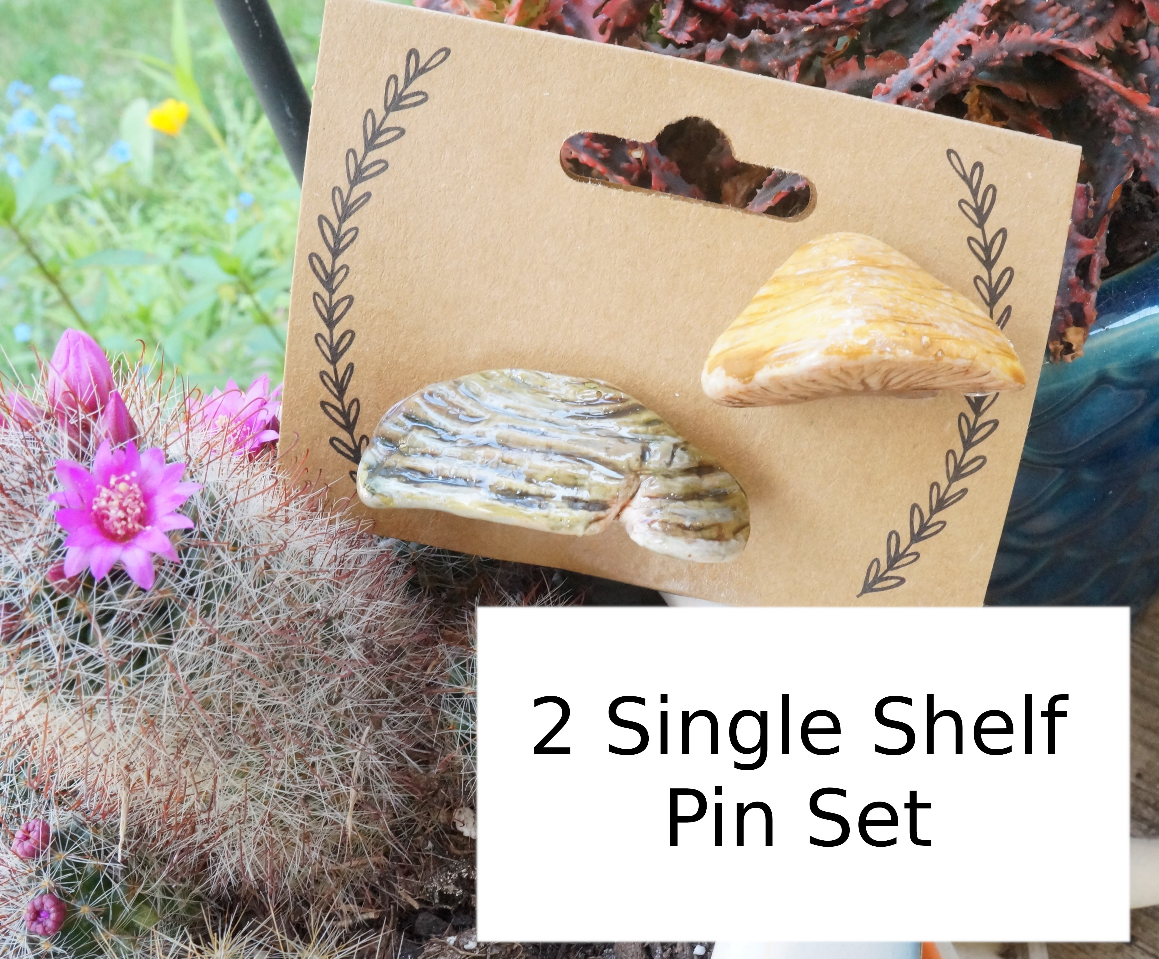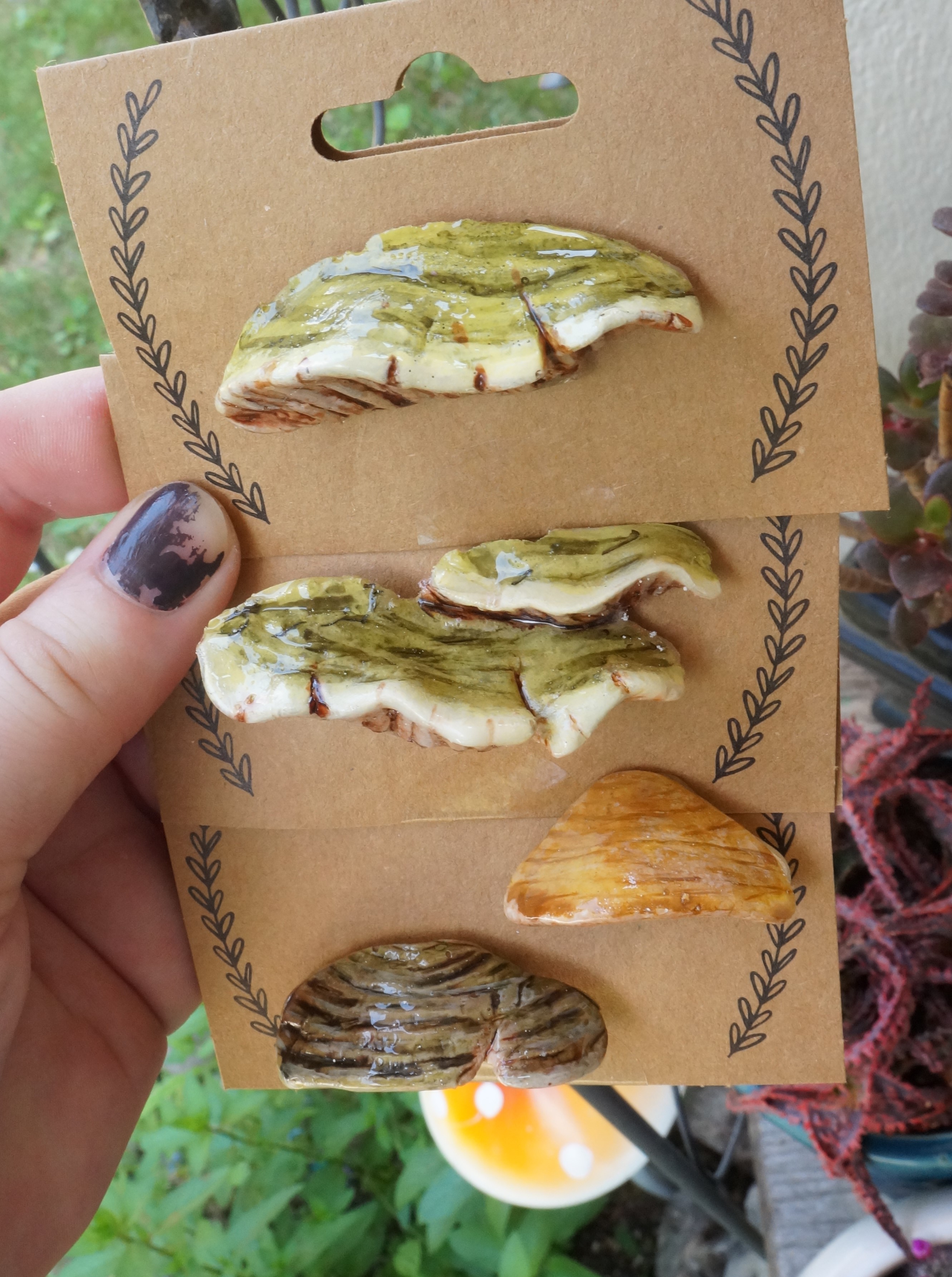 Pins are made from my own sculpt of shelf mushrooms. Made from light weight resin and hand painted.