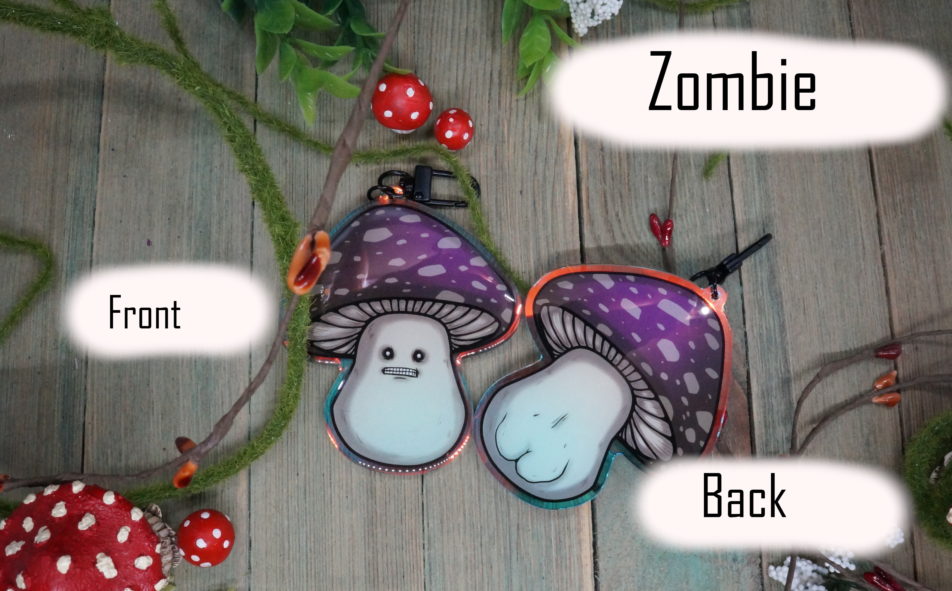 Zombie mushroom on rainbow acrylic with resin dome on front.