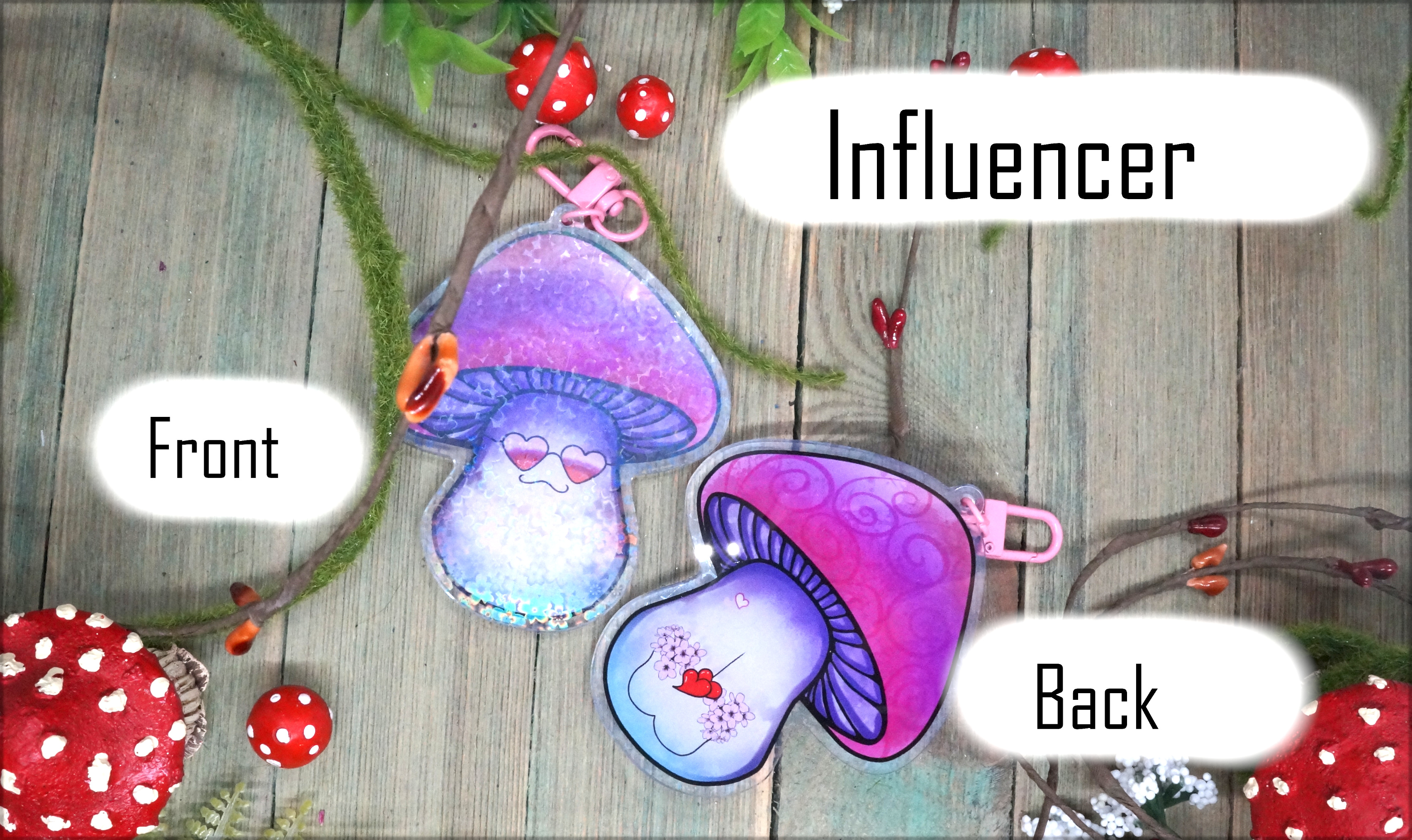 Influencer Mushroom on clear acrylic with flower holographic overlay.