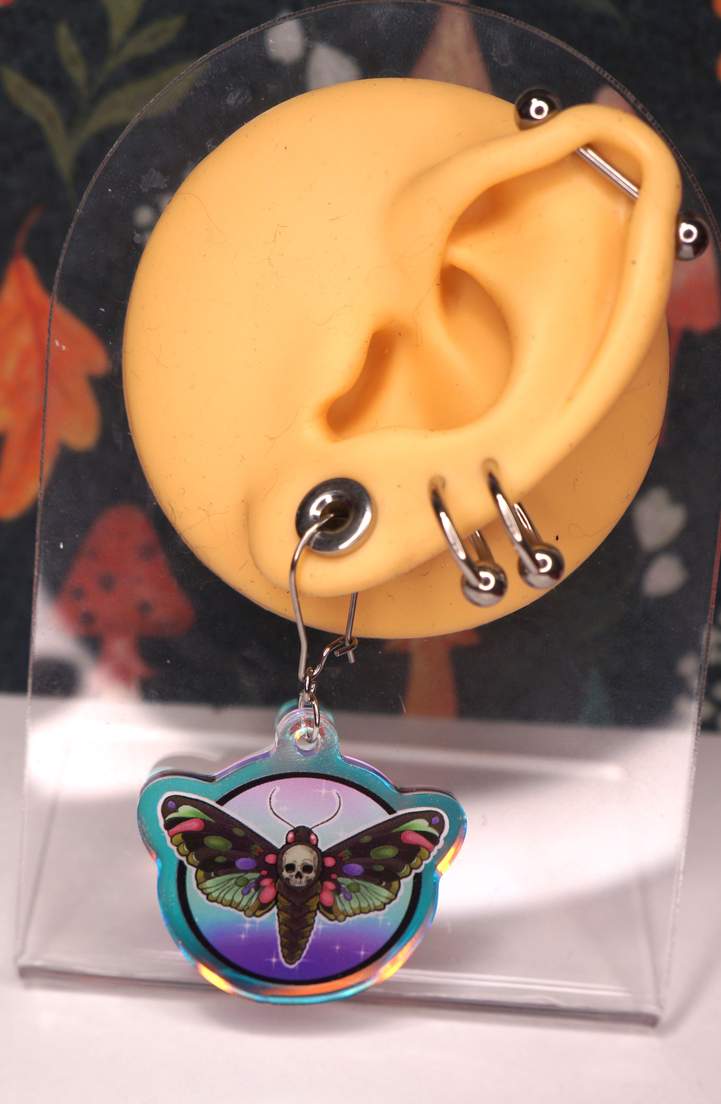 Earrings are of my moth design on iridescent acrylic, with stainless steel hoops. Leave a note with your order if you want your earrings switched to plastic hooks or clip ons.