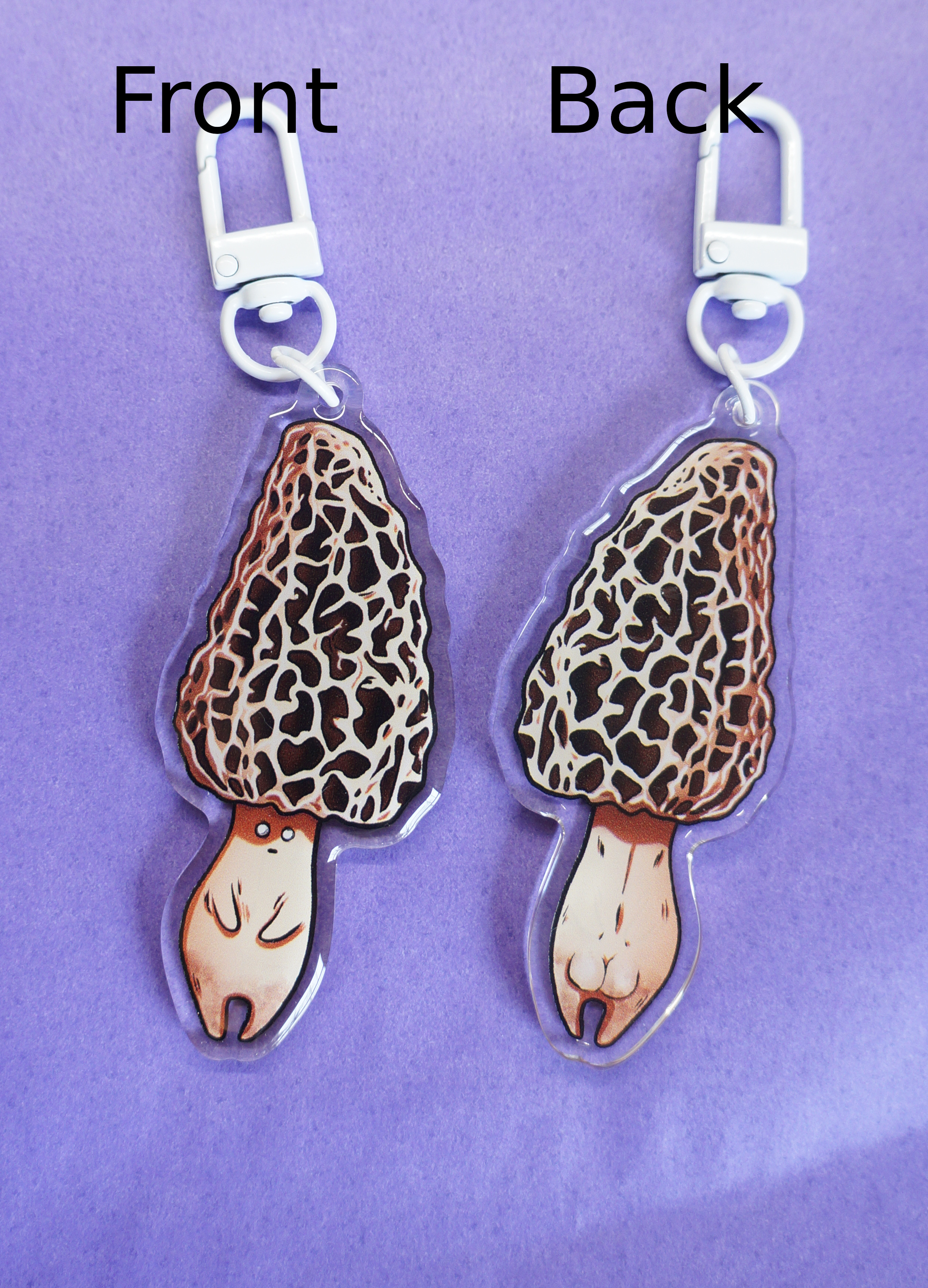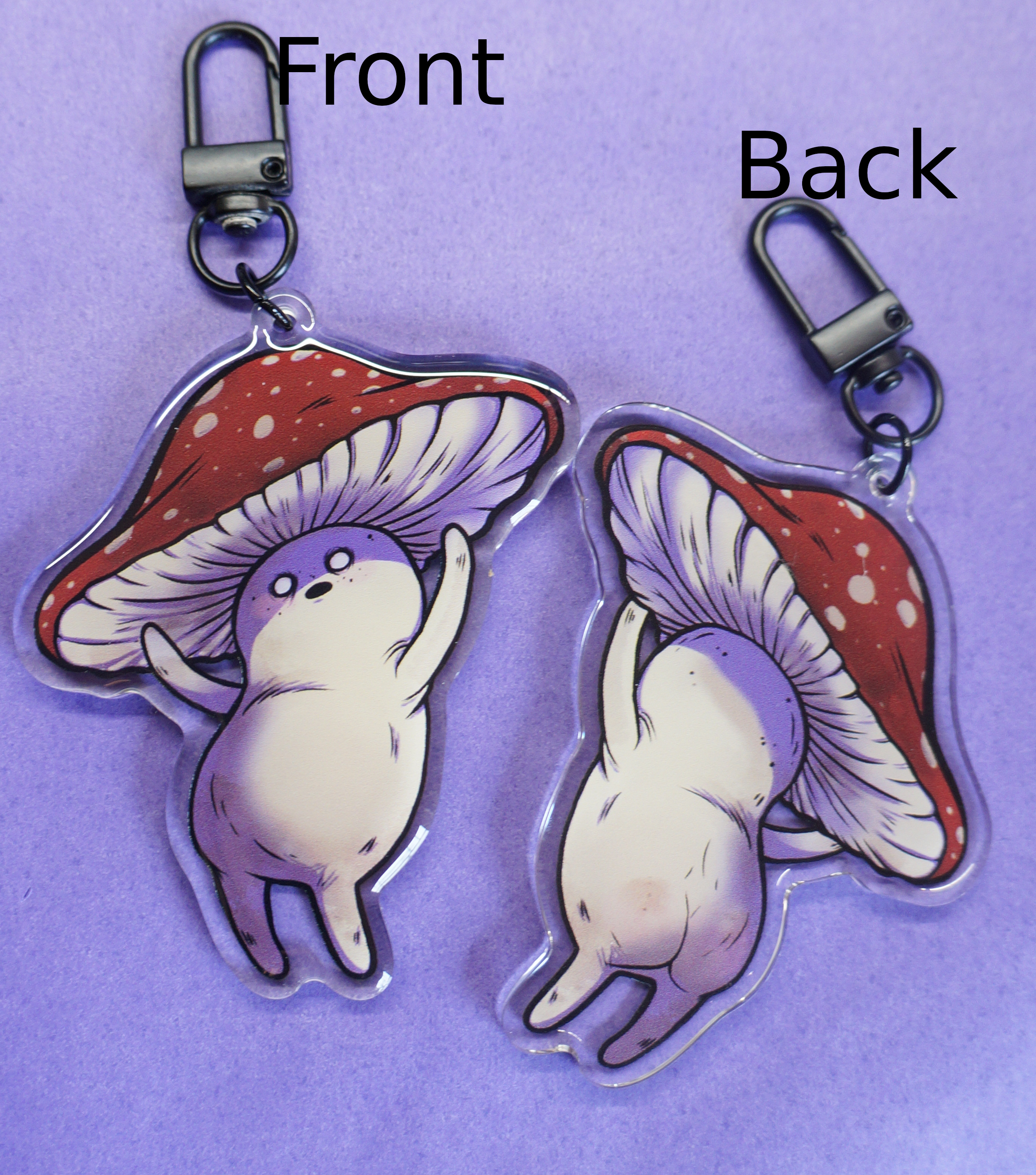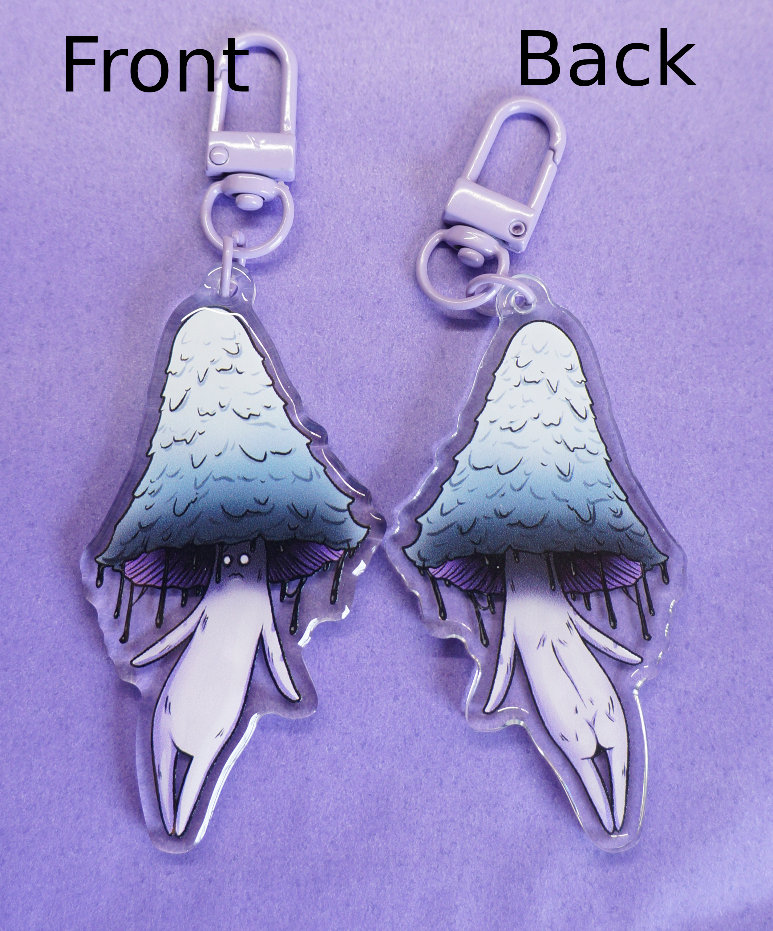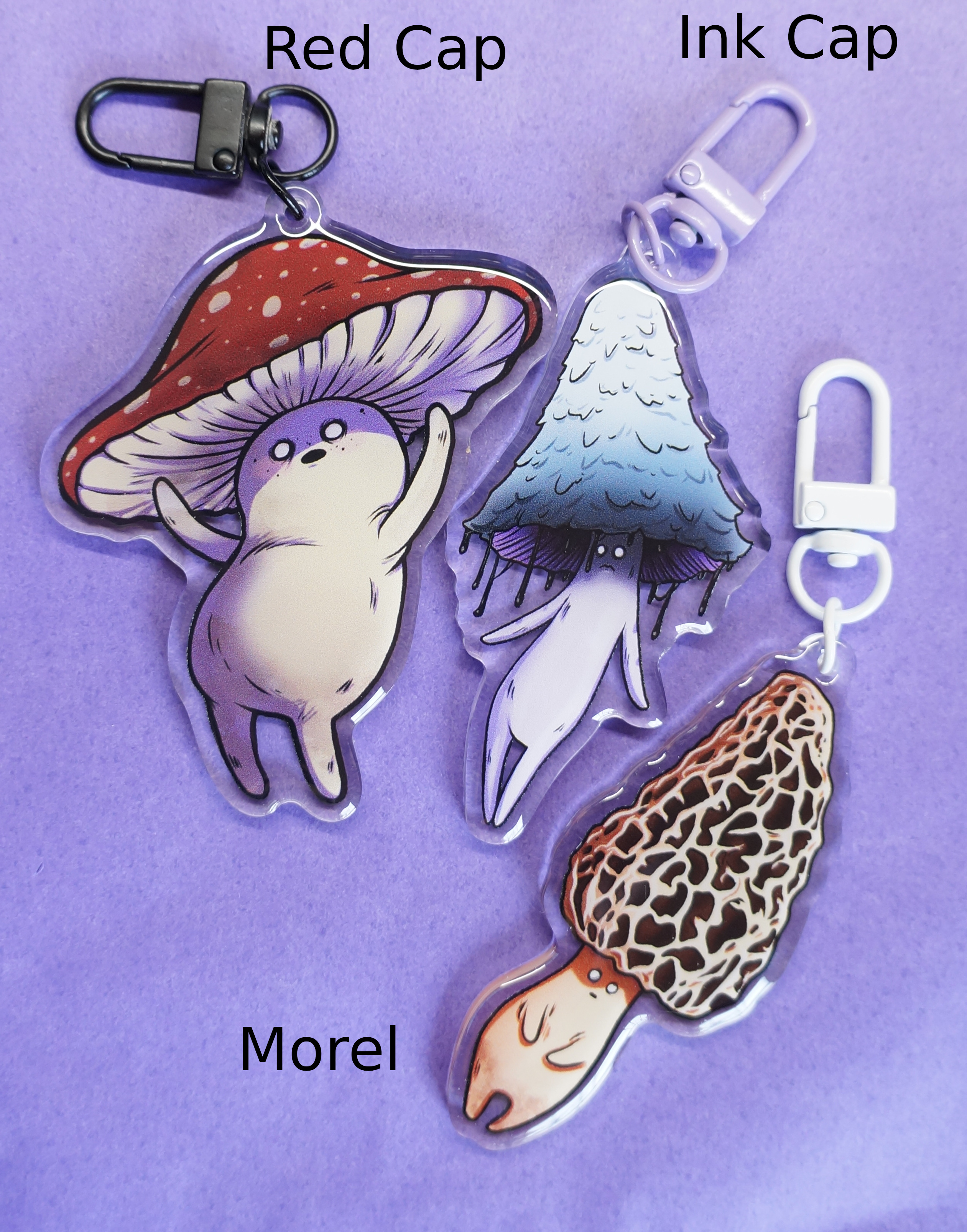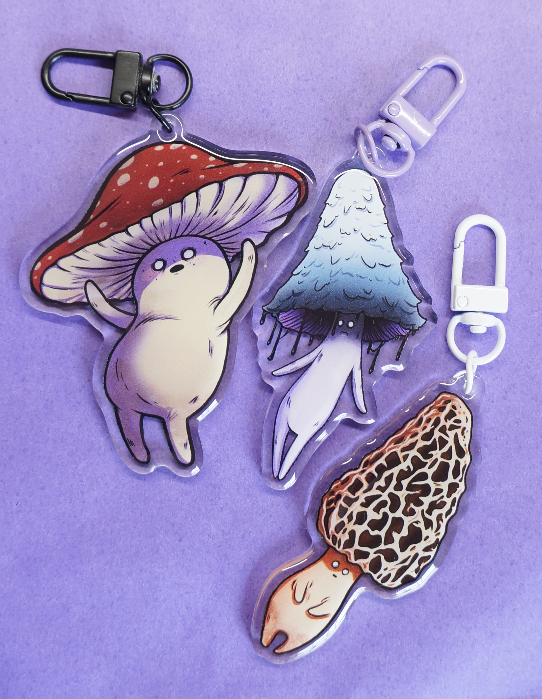 Each keychain is made of acrylic with a resin dome on the front and a colored metal carabiner key chain. The artwork is mine of my dancing mushrooms, double side print with booties on the back side.