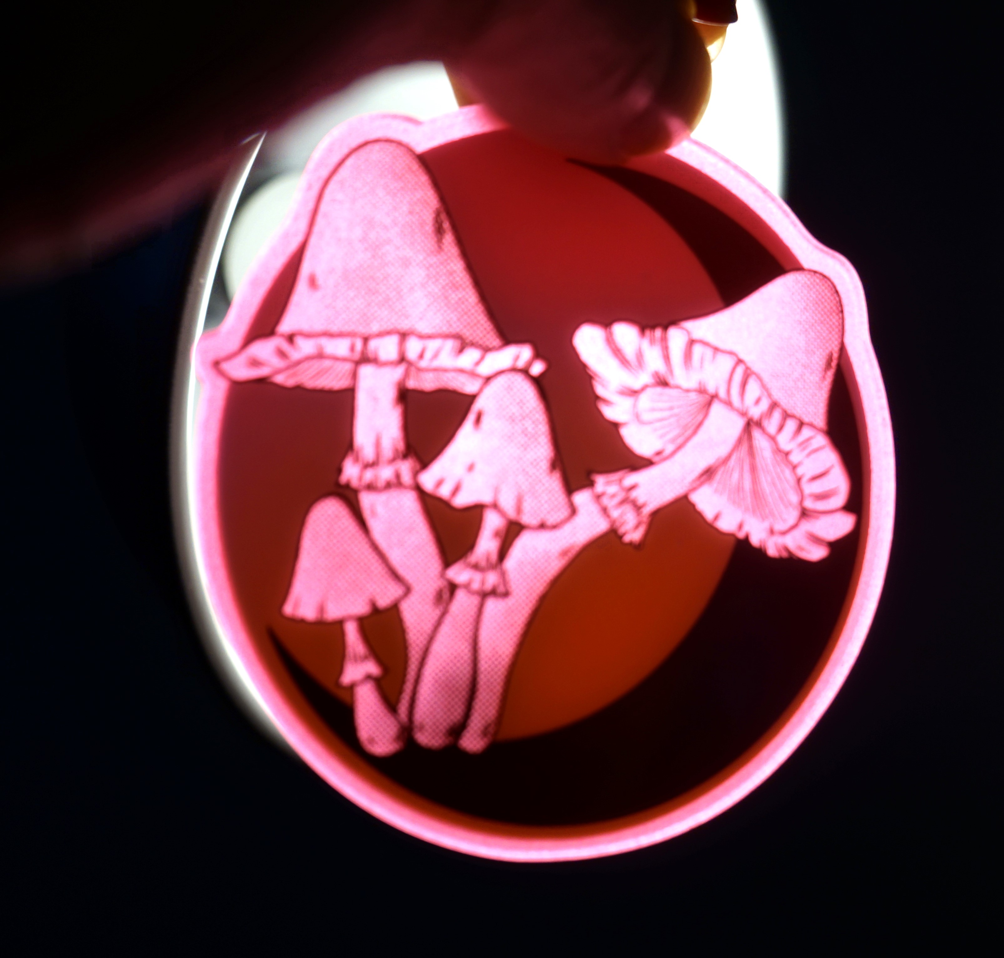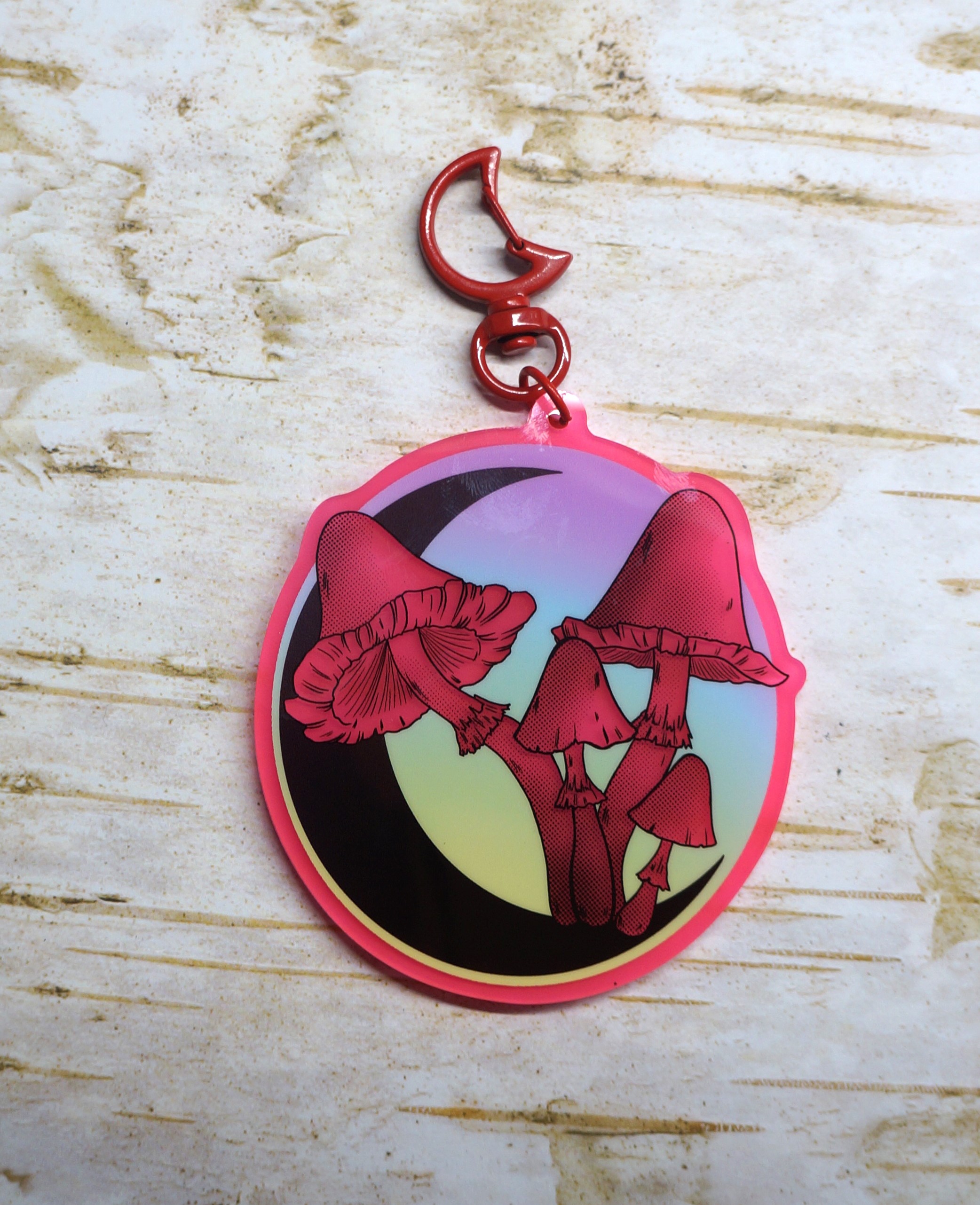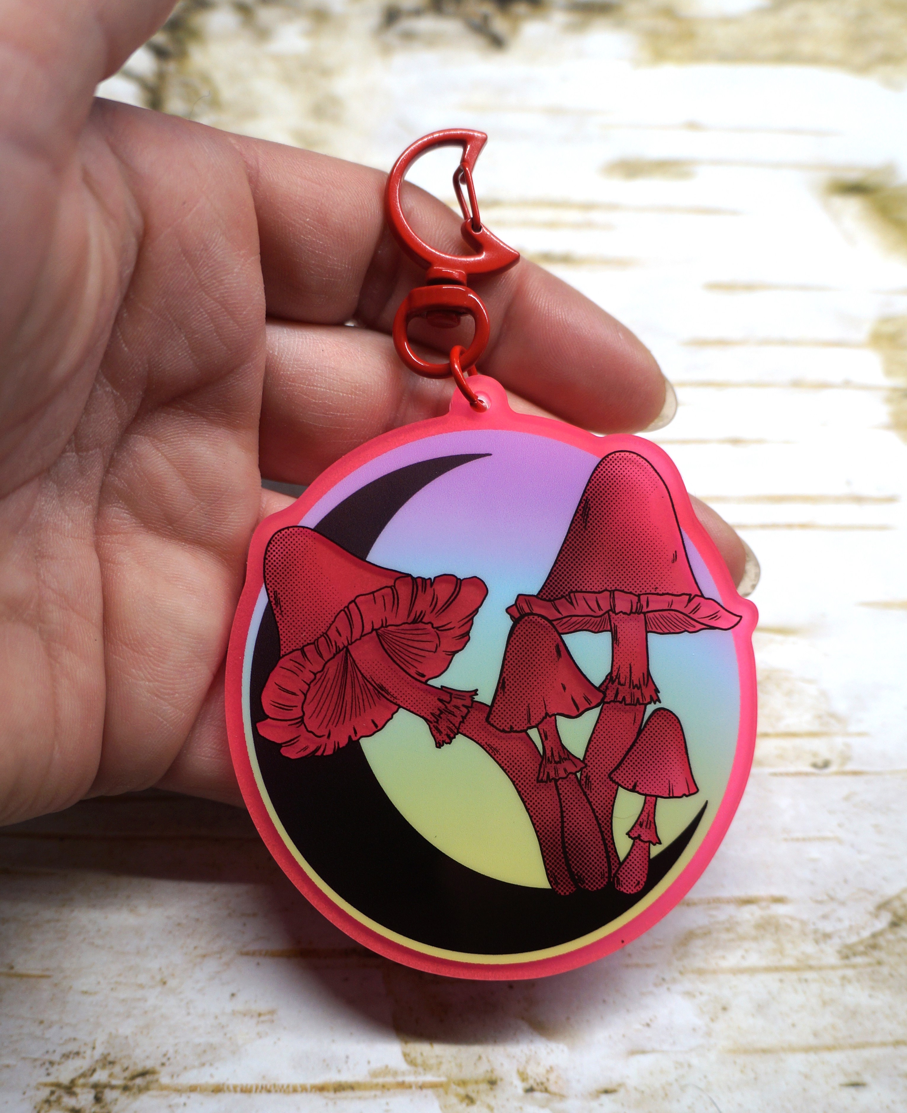 Keychain is on glow in the dark red acrylic, and glows a sort of pinkish red, with red crescent moon clasp.