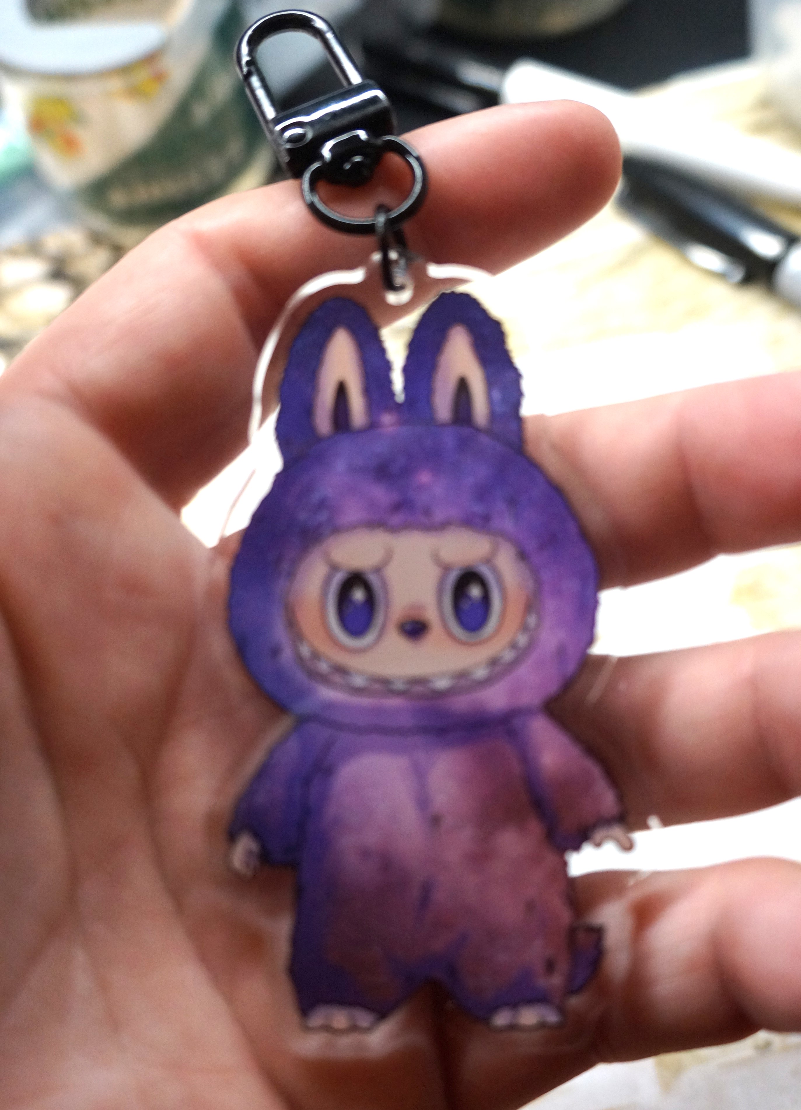 Keychain charms are printed on clear acrylic, double sided, same image, black metal clasp, 3 inches tall.