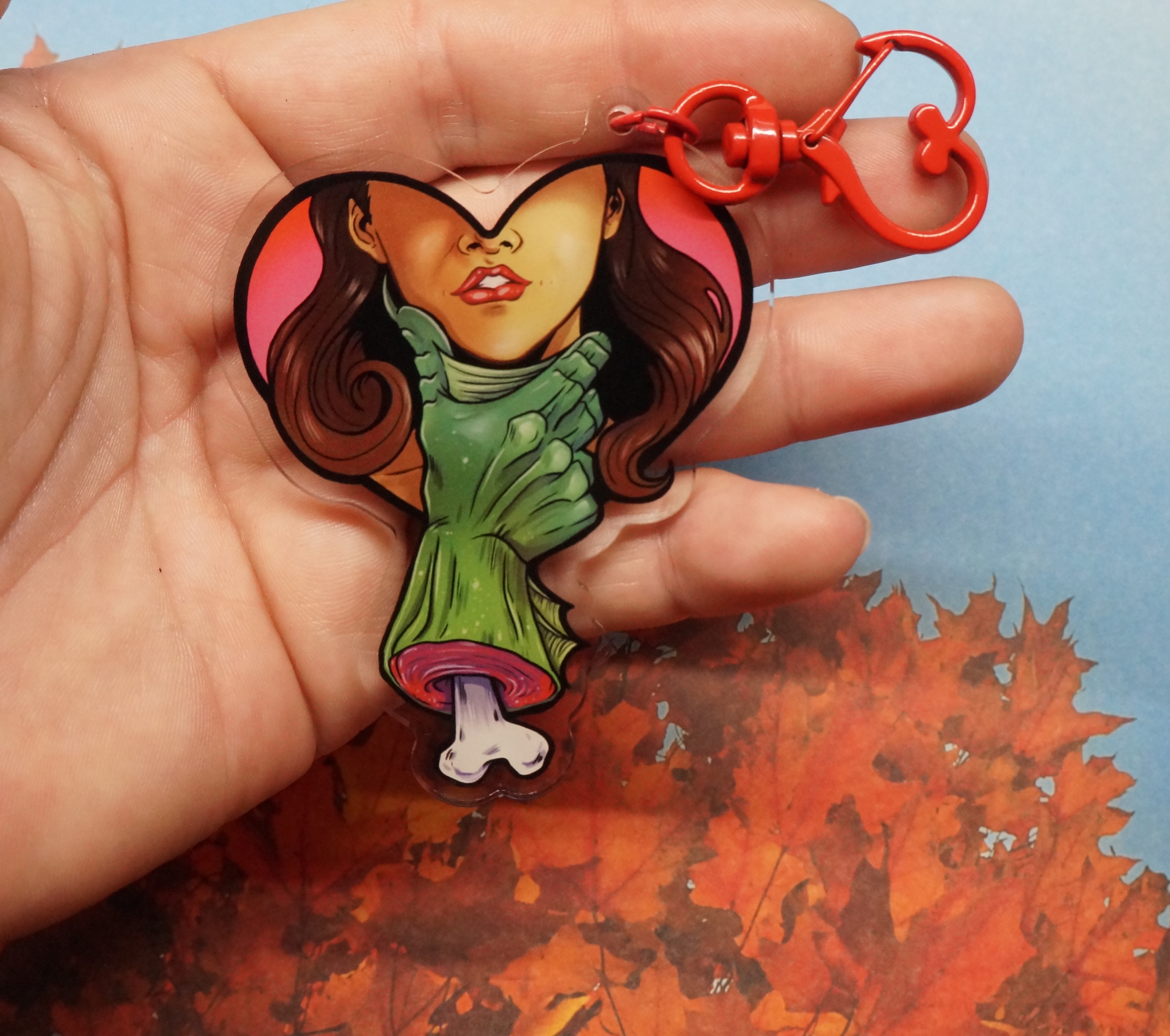 Printed on double sided clear acrylic, 3 inches of monster fantasy lol. Default is the keychain.