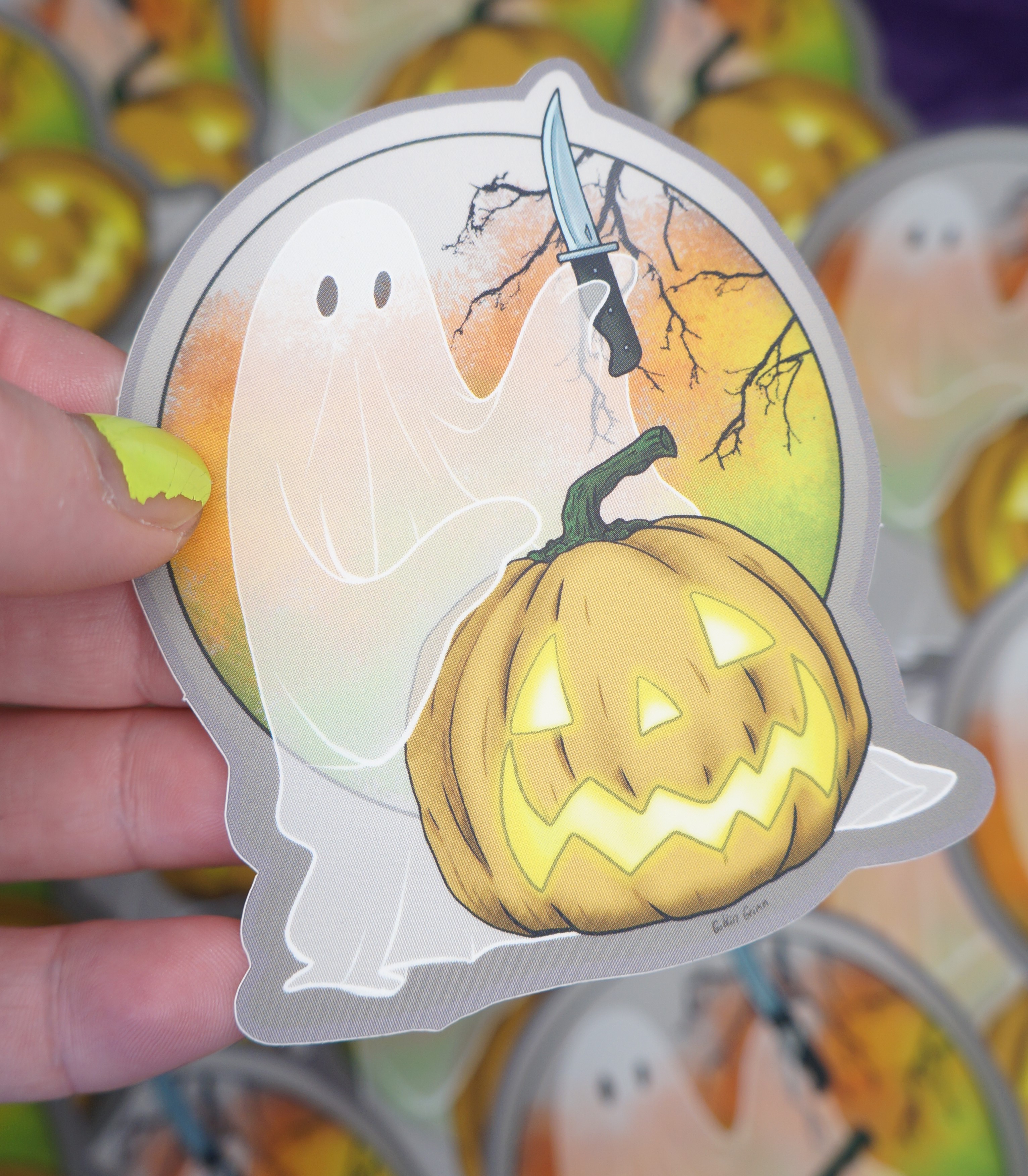 Sticker is larger than the usual, matte finish of a ghost carving a pumpkin for Halloween.