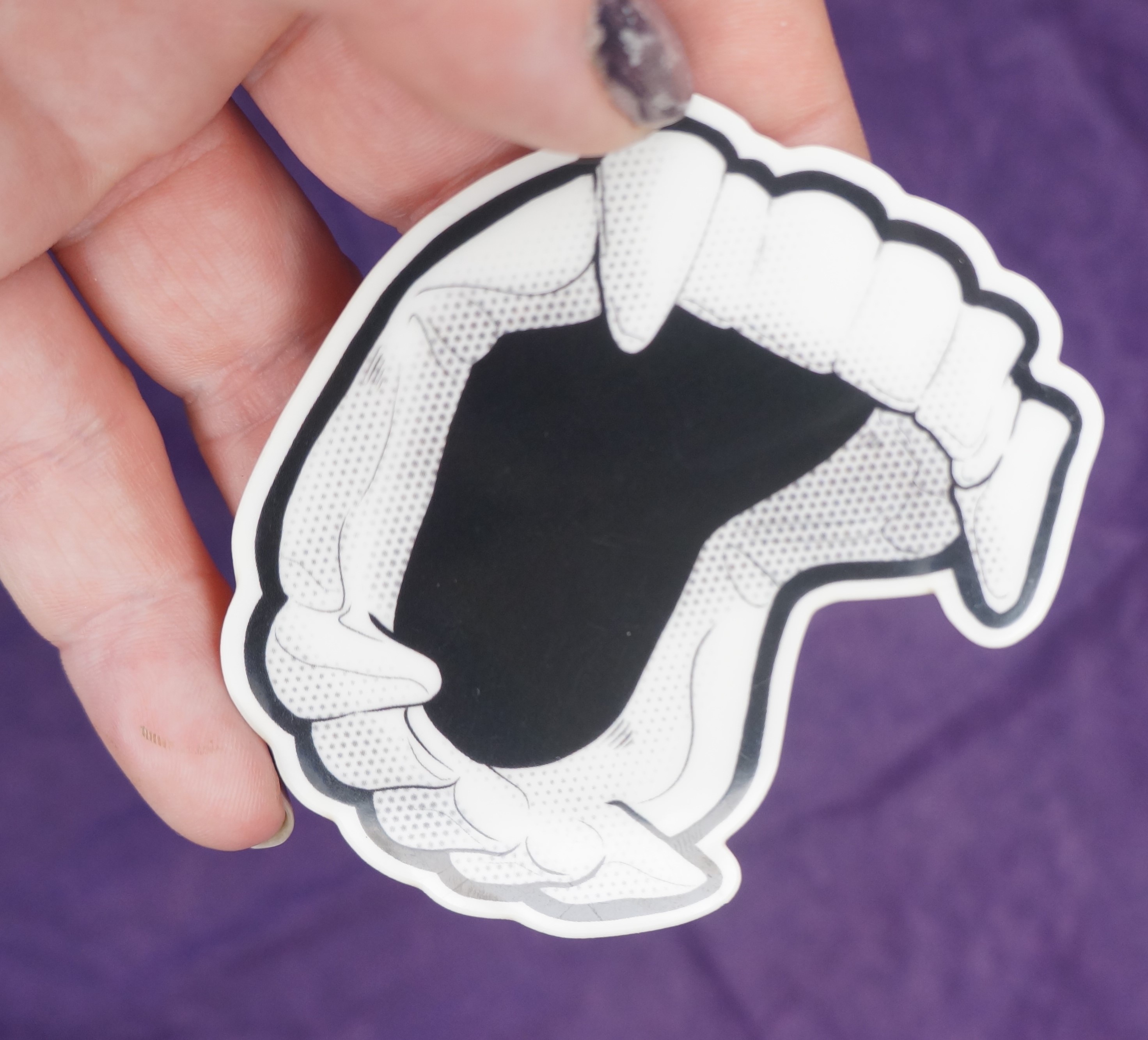 Sticker is heavy duty vinyl, glow in the dark material of my vampire teeth design.