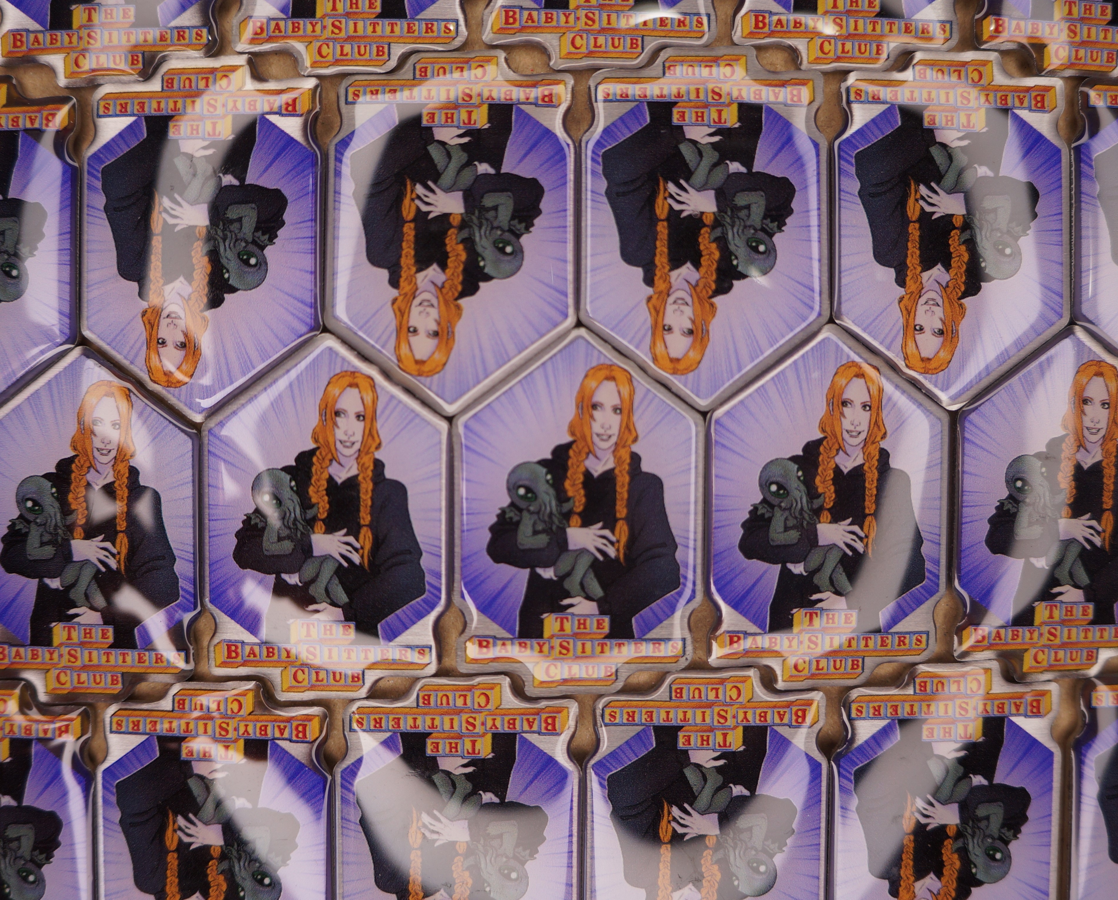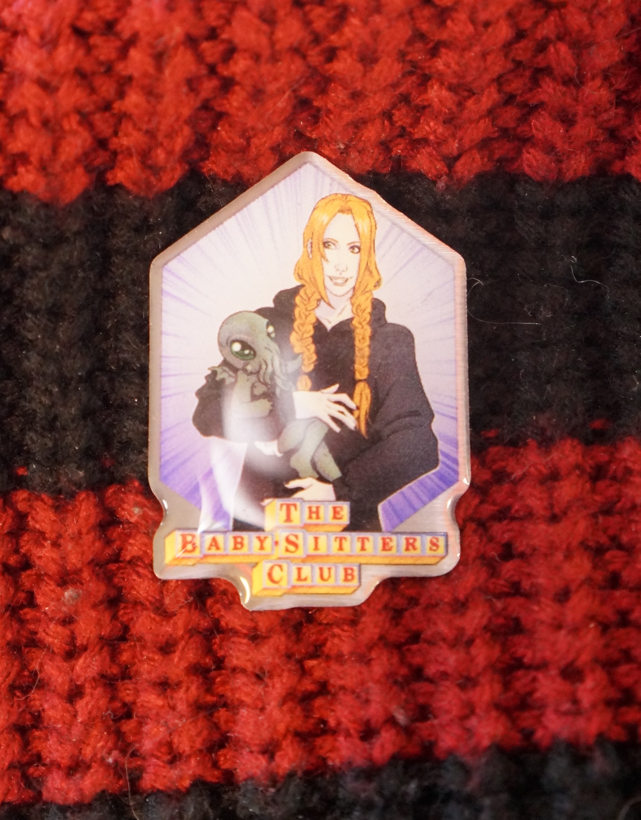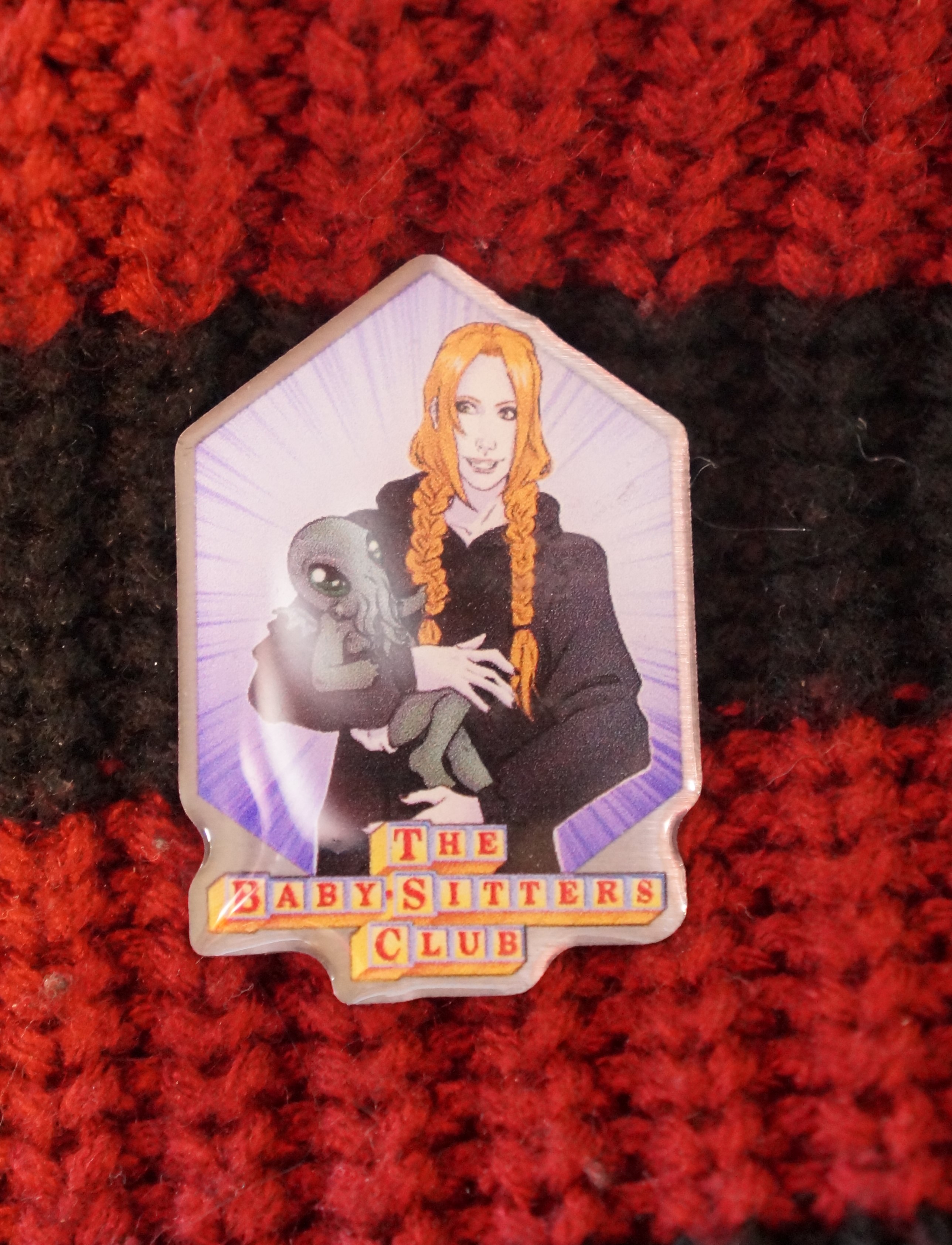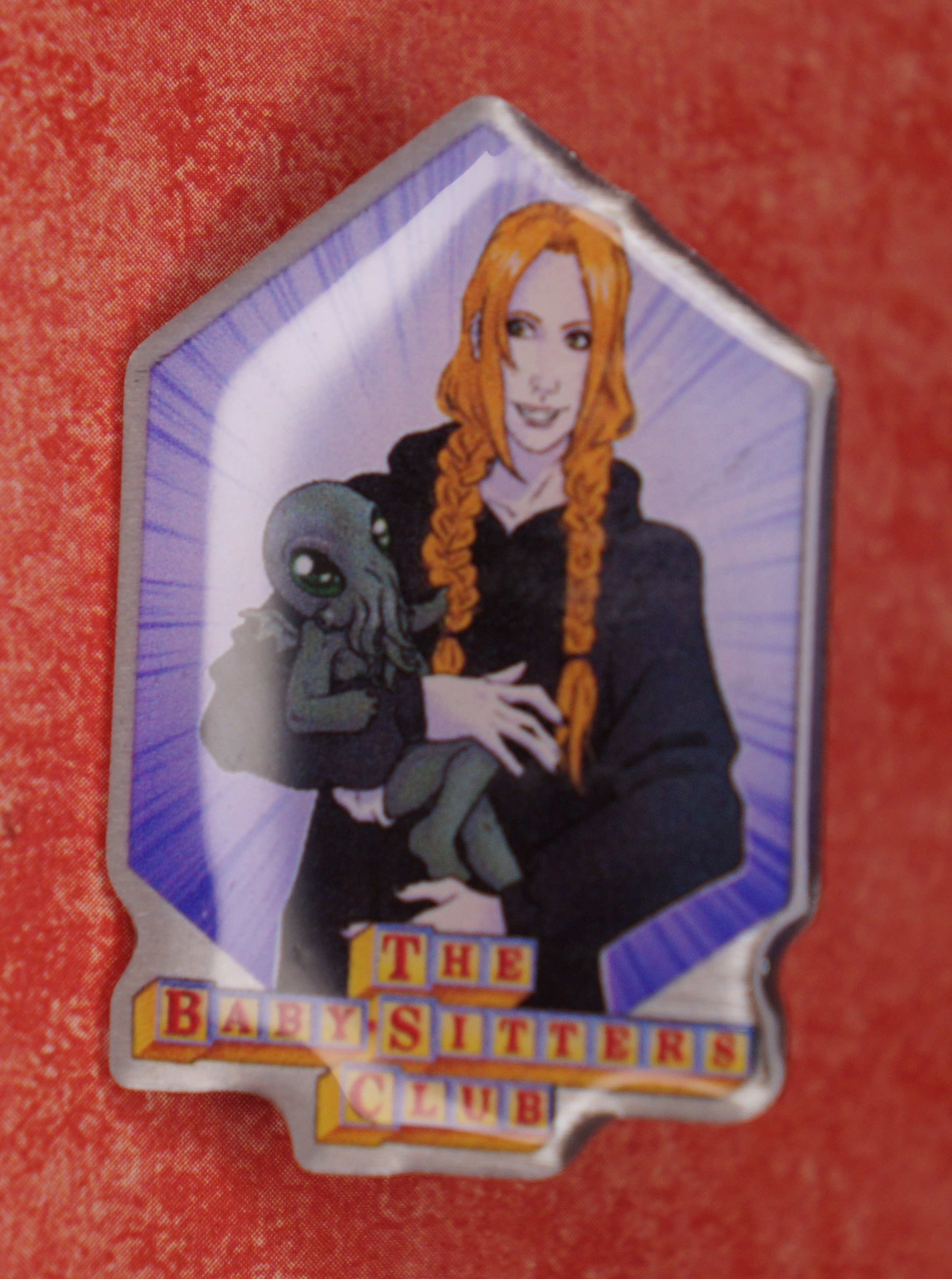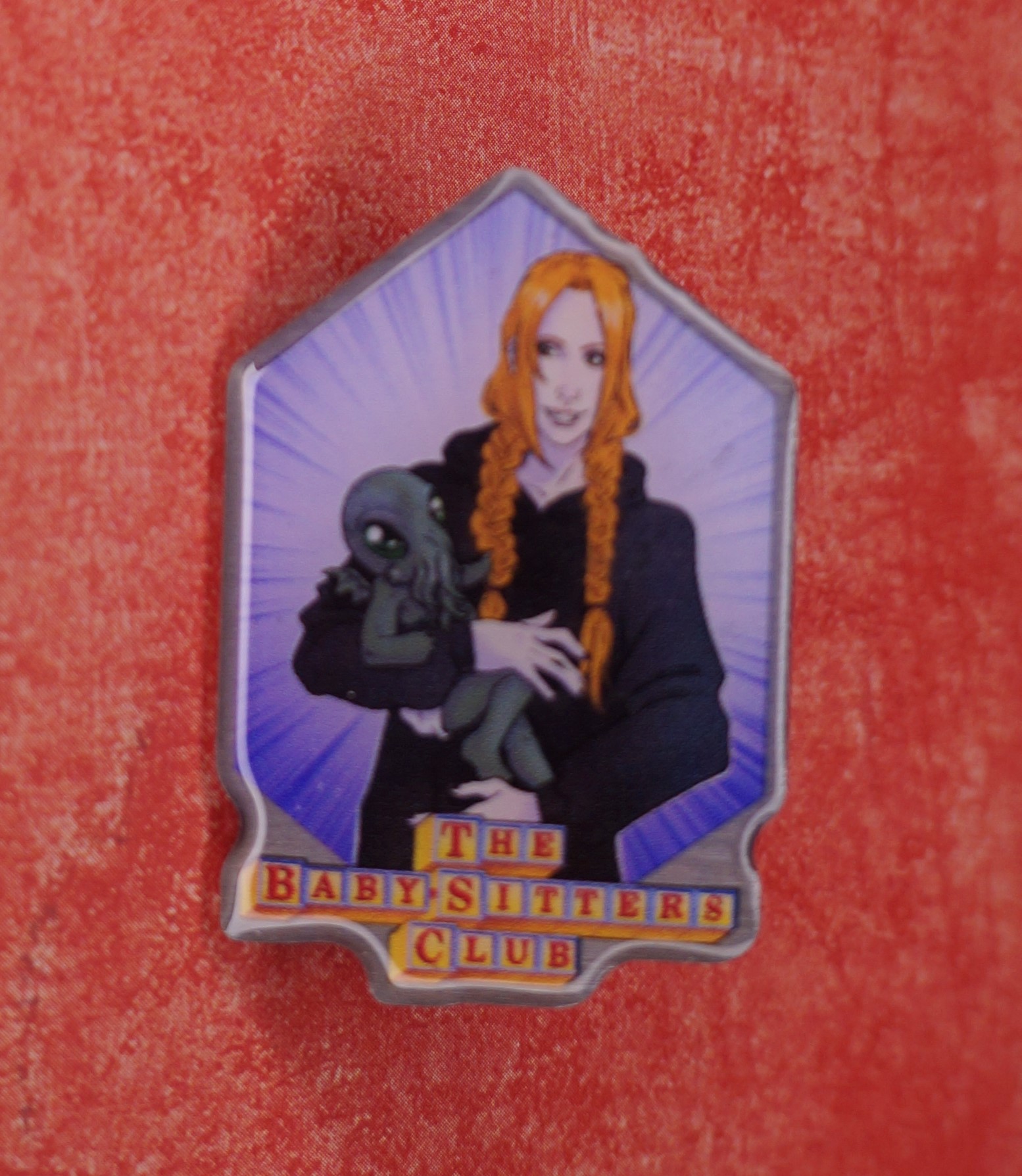 Babysitter's Club design of Hell's Belles Lily with Cutethuhlu baby. On metal base with heart stamped design on back and 2 pin posts, front is photo printed with hard resin dome.