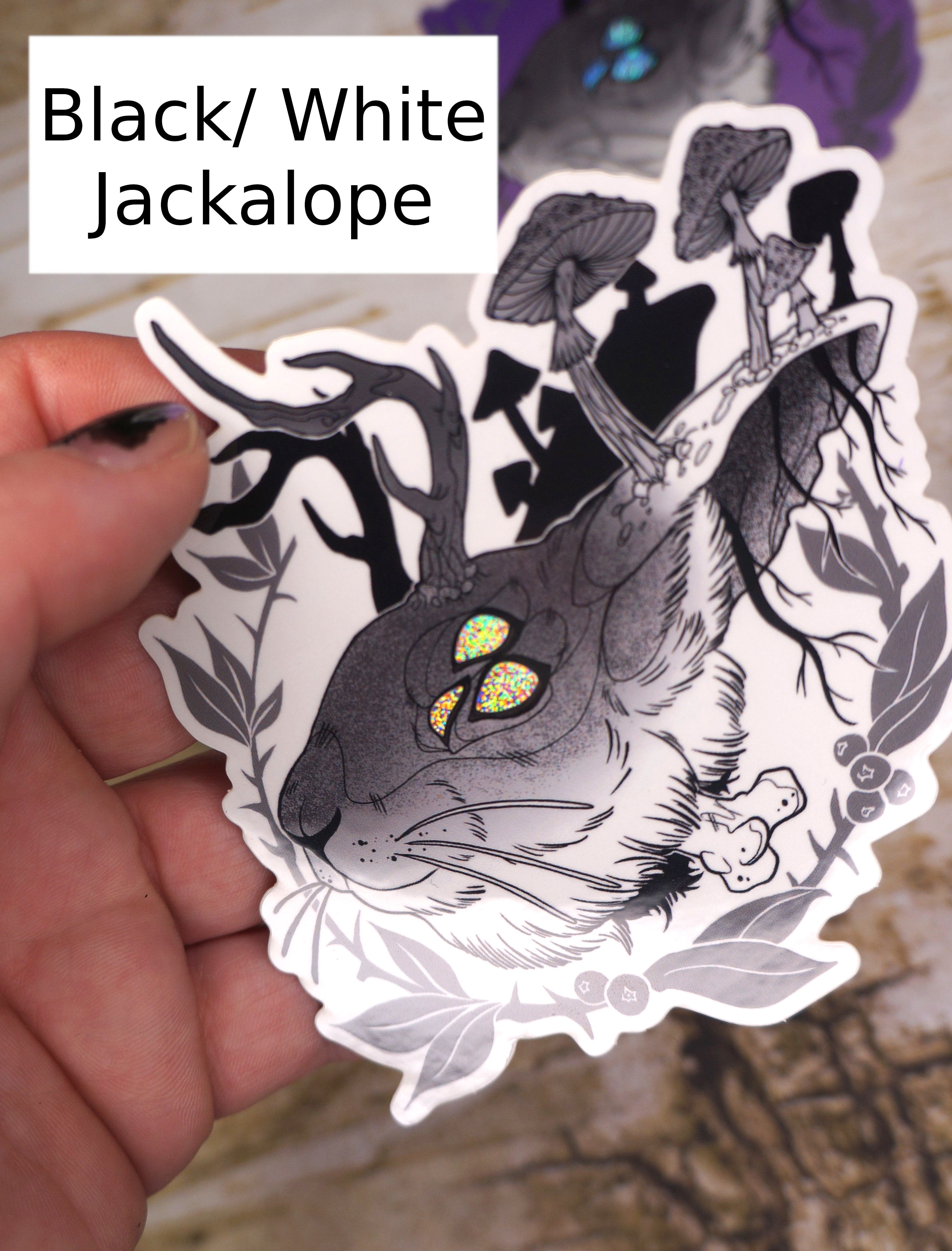 Stickers are larger, about 5 inches, gloss finish. The jackalope stickers have glitter eye details.