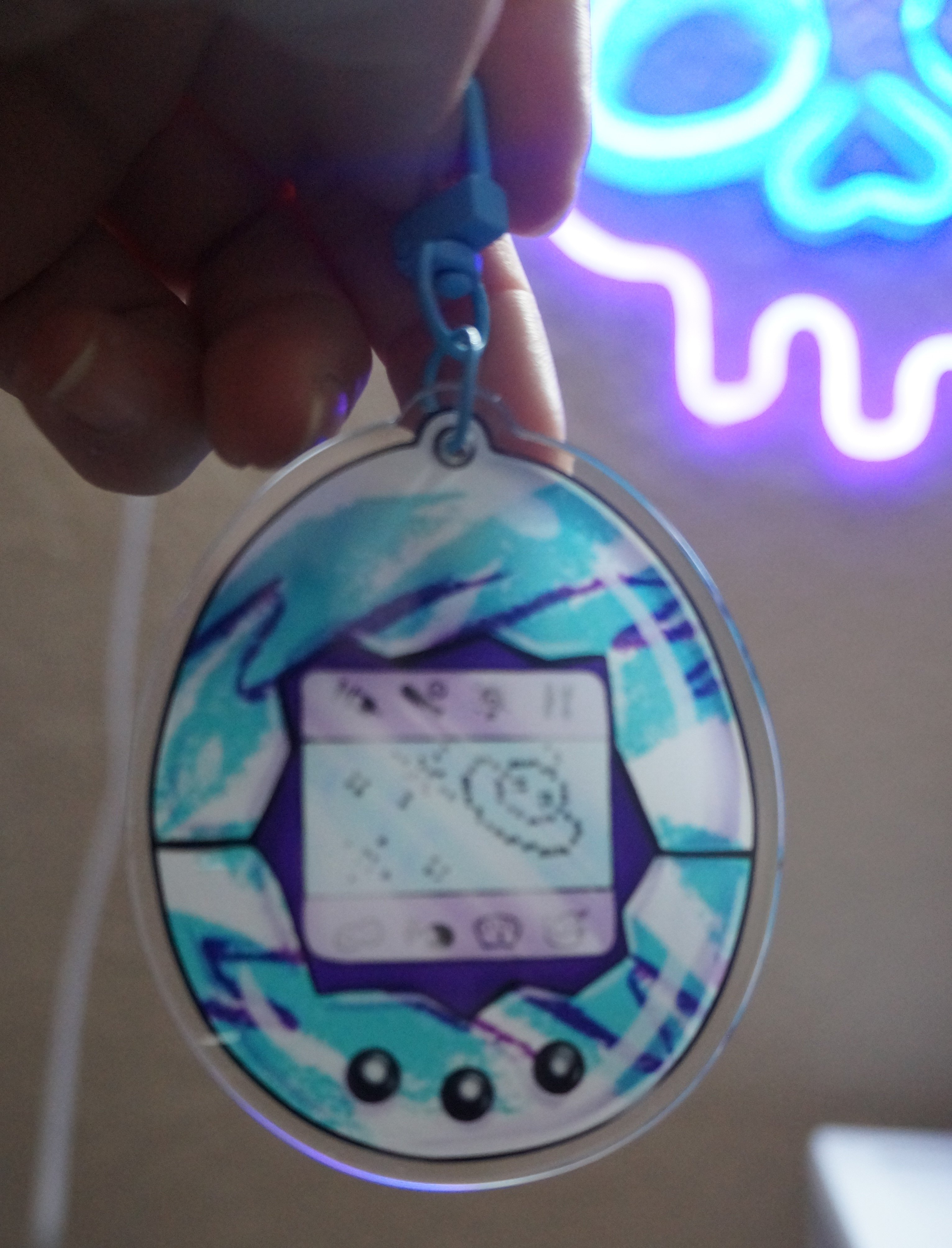 Double sided print with same image on each side. Resin dome on one side with metal clip. My artwork of the retro cup design on a Tamagochi.