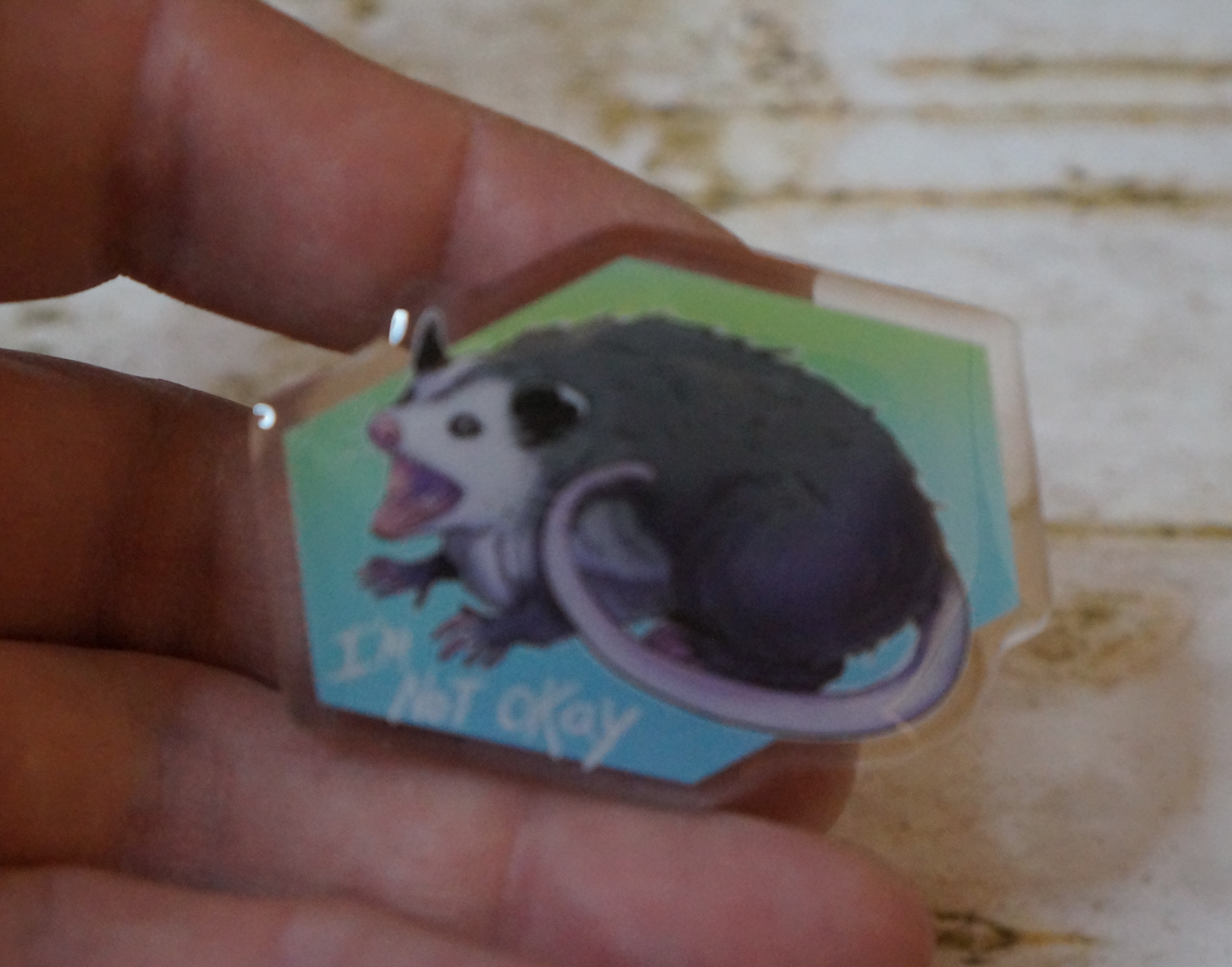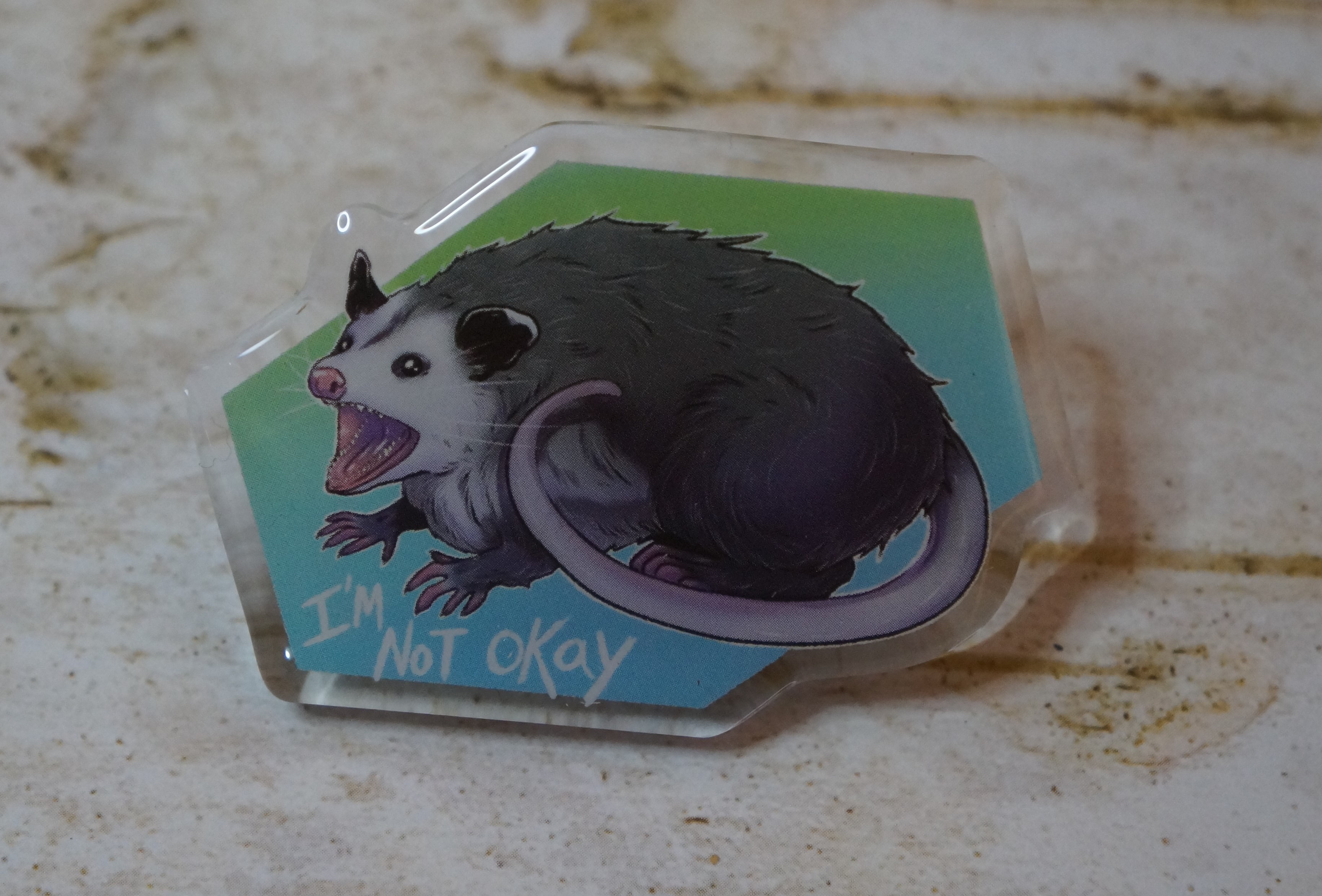 My "I'm not Okay" Possum design on an acrylic, 2 inch pin, with resin dome on the front. Heart shaped rubber pin back.