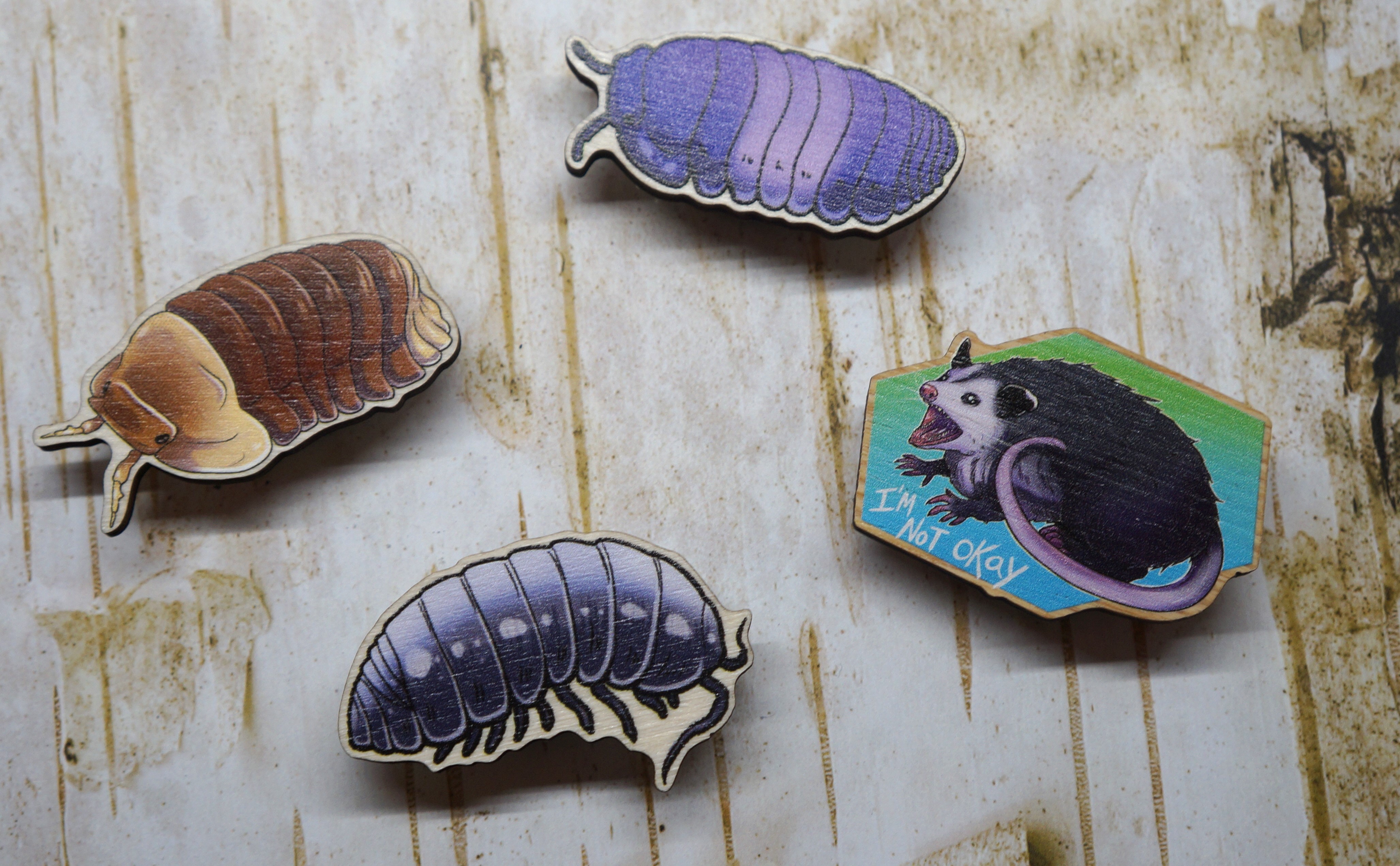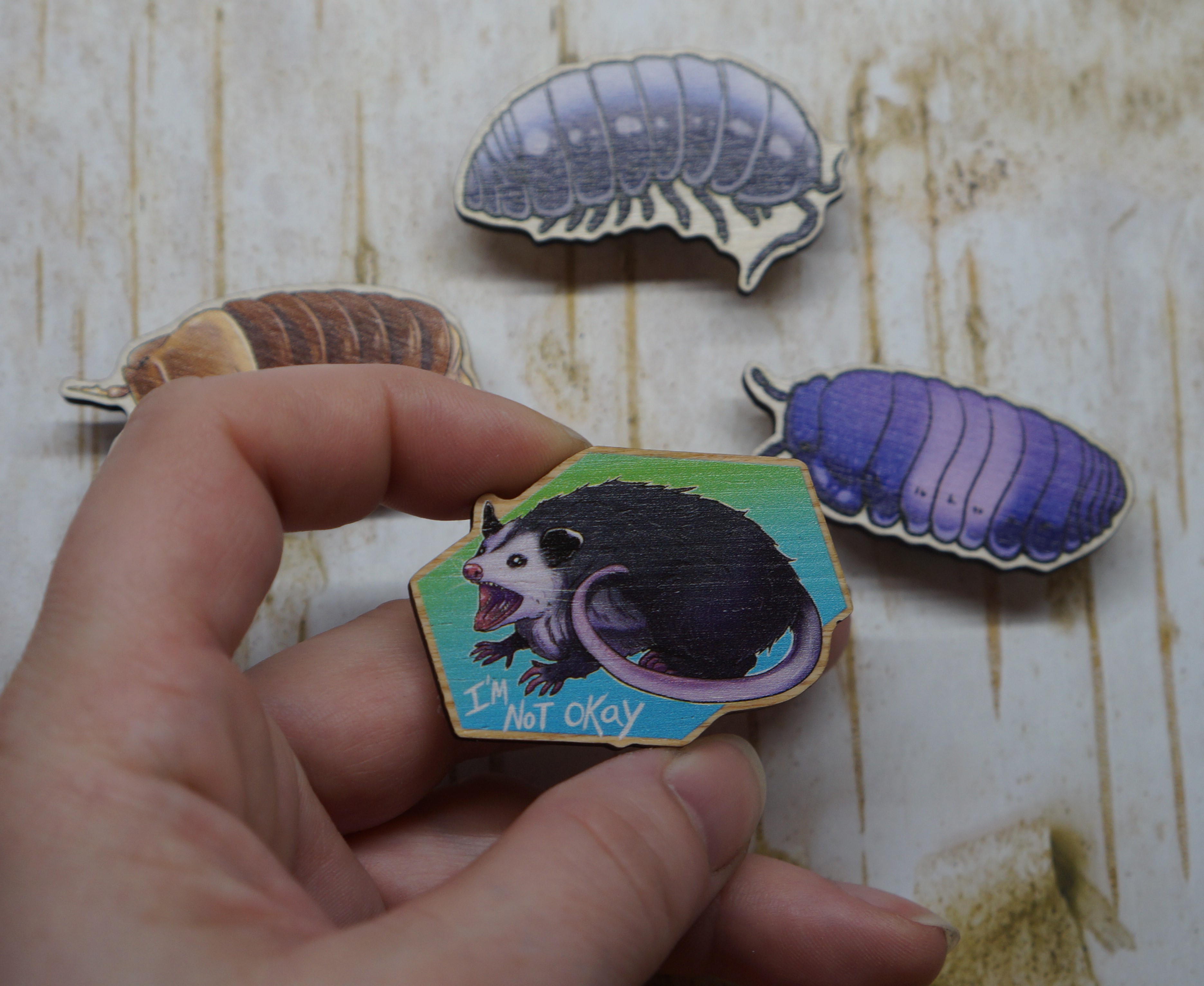 Magnets are made of wood with art printed on them, about 2 inches, with a strong magnet on the back. Perfect for the fridge.