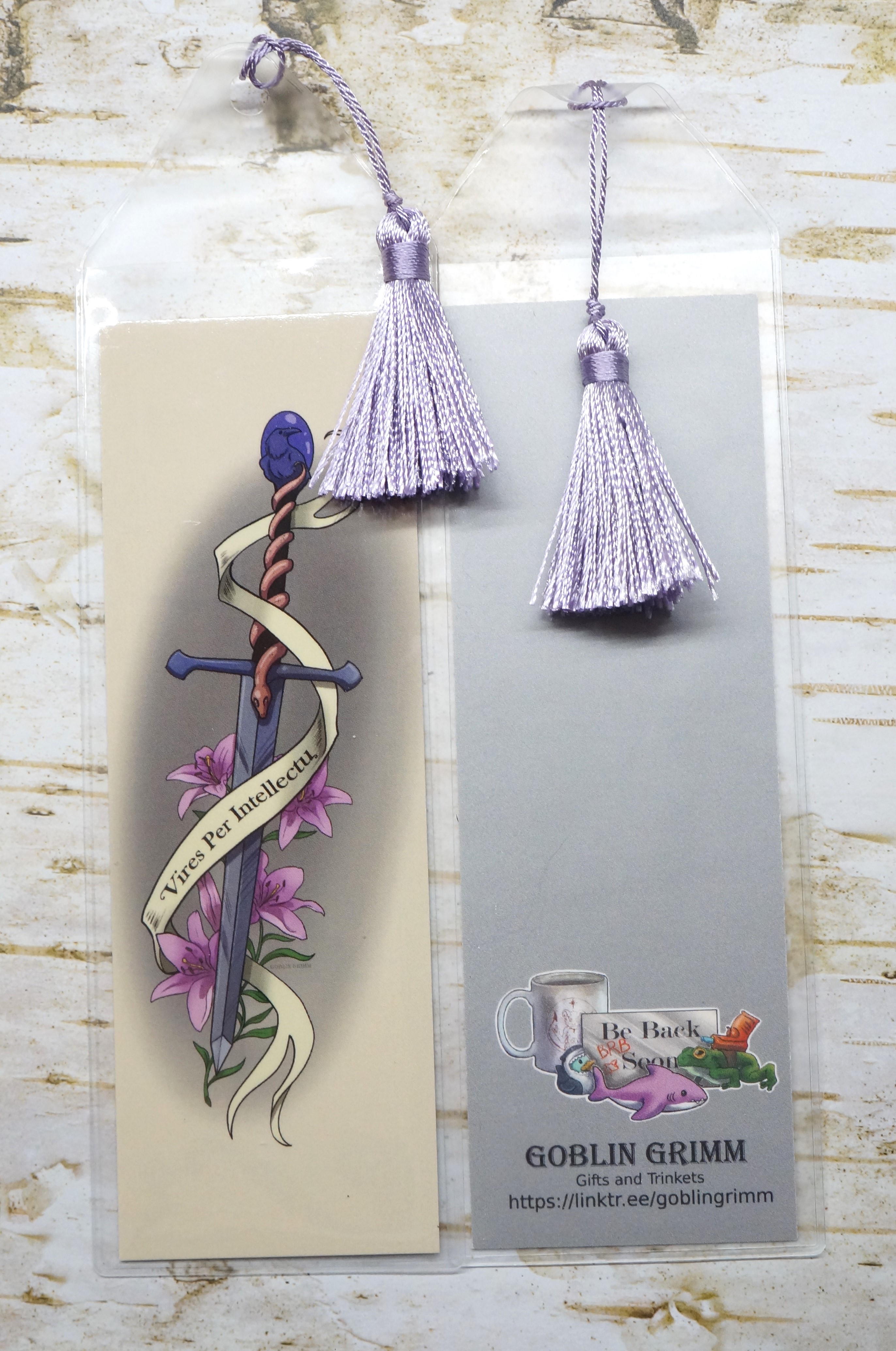 For Whom The Belle Tolls bookmark, front and back view shown in pic, with clear slip cover and lilac purple tassel.