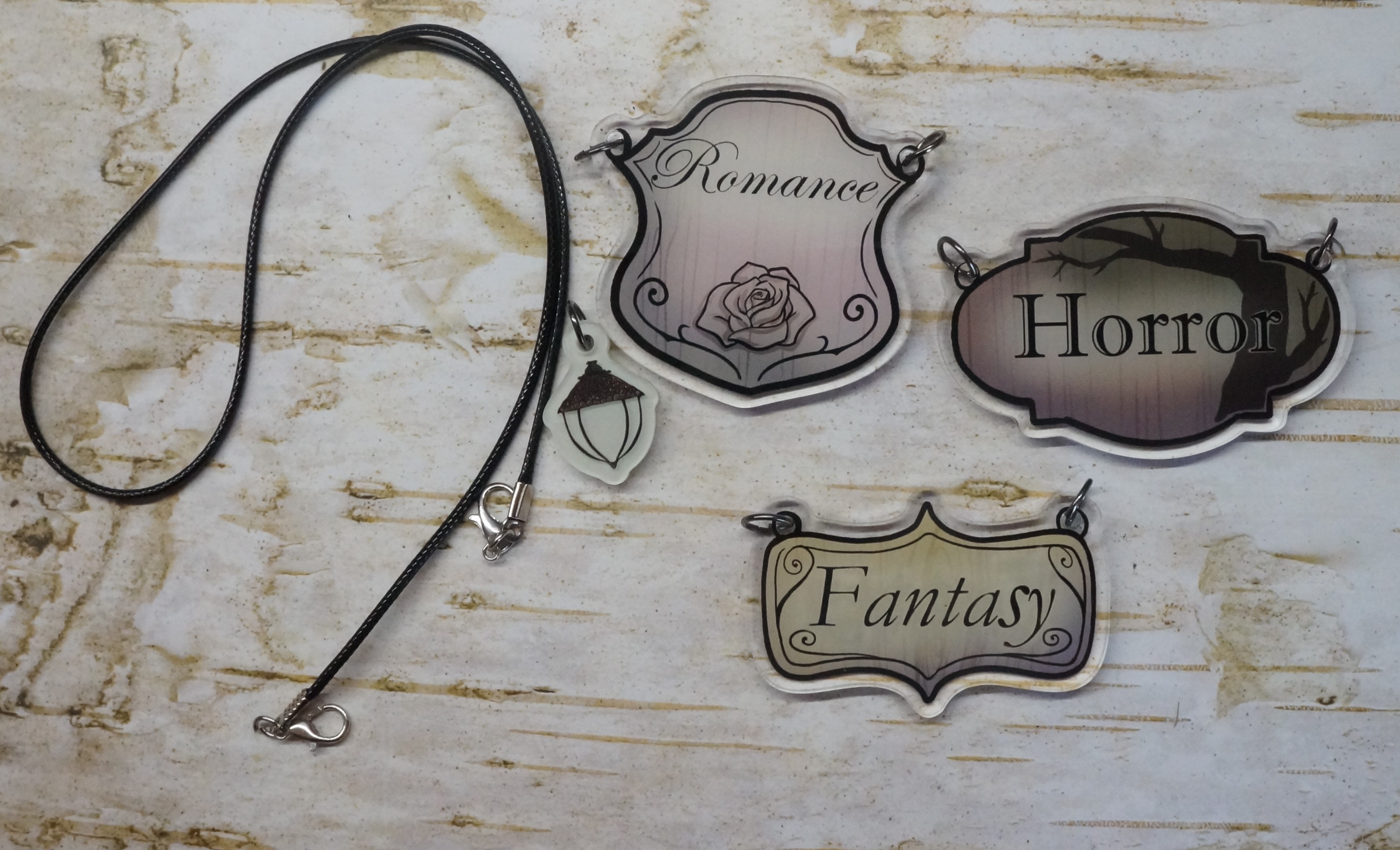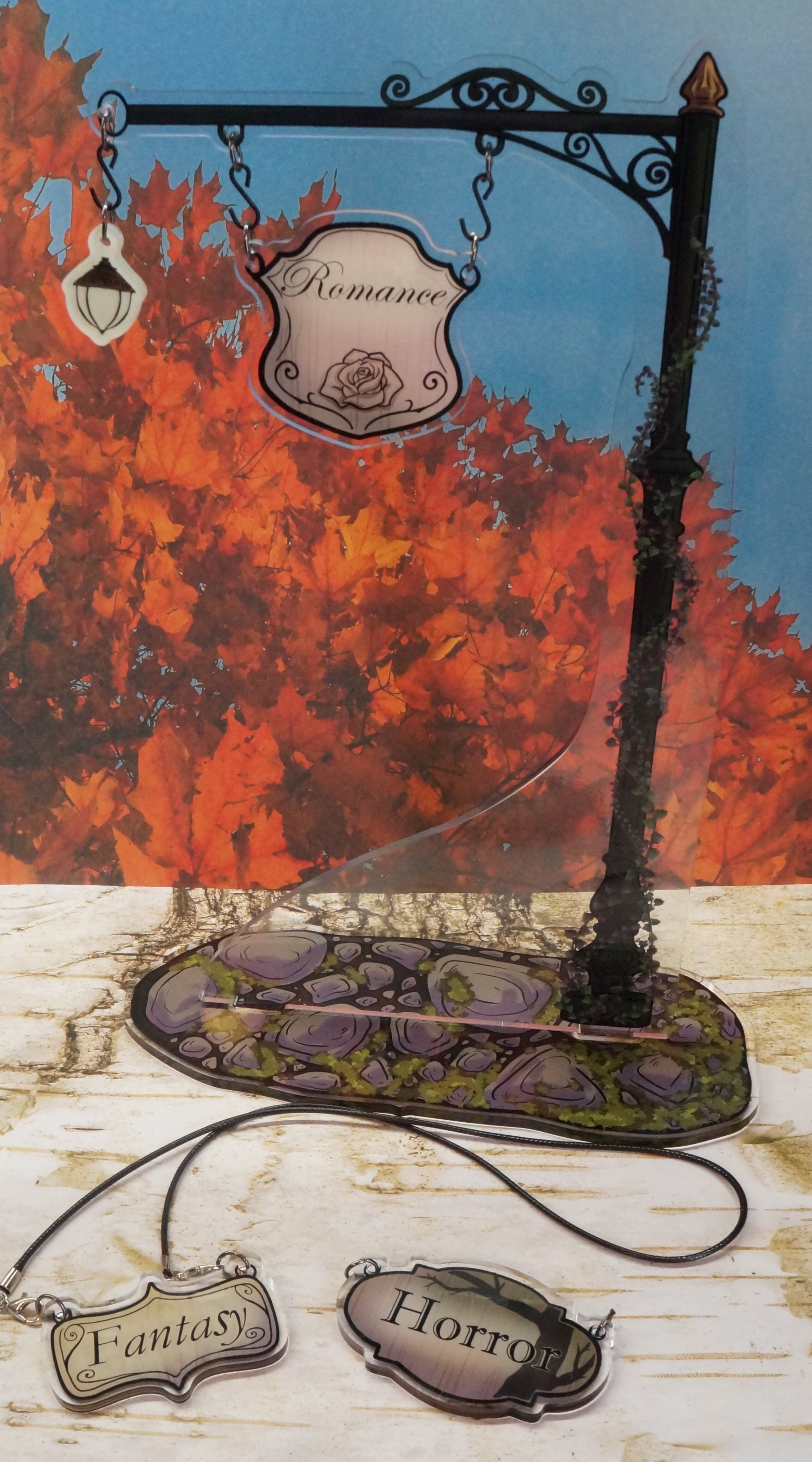 3 acrylic hangable signs (Horror, Fantasy, Romance)