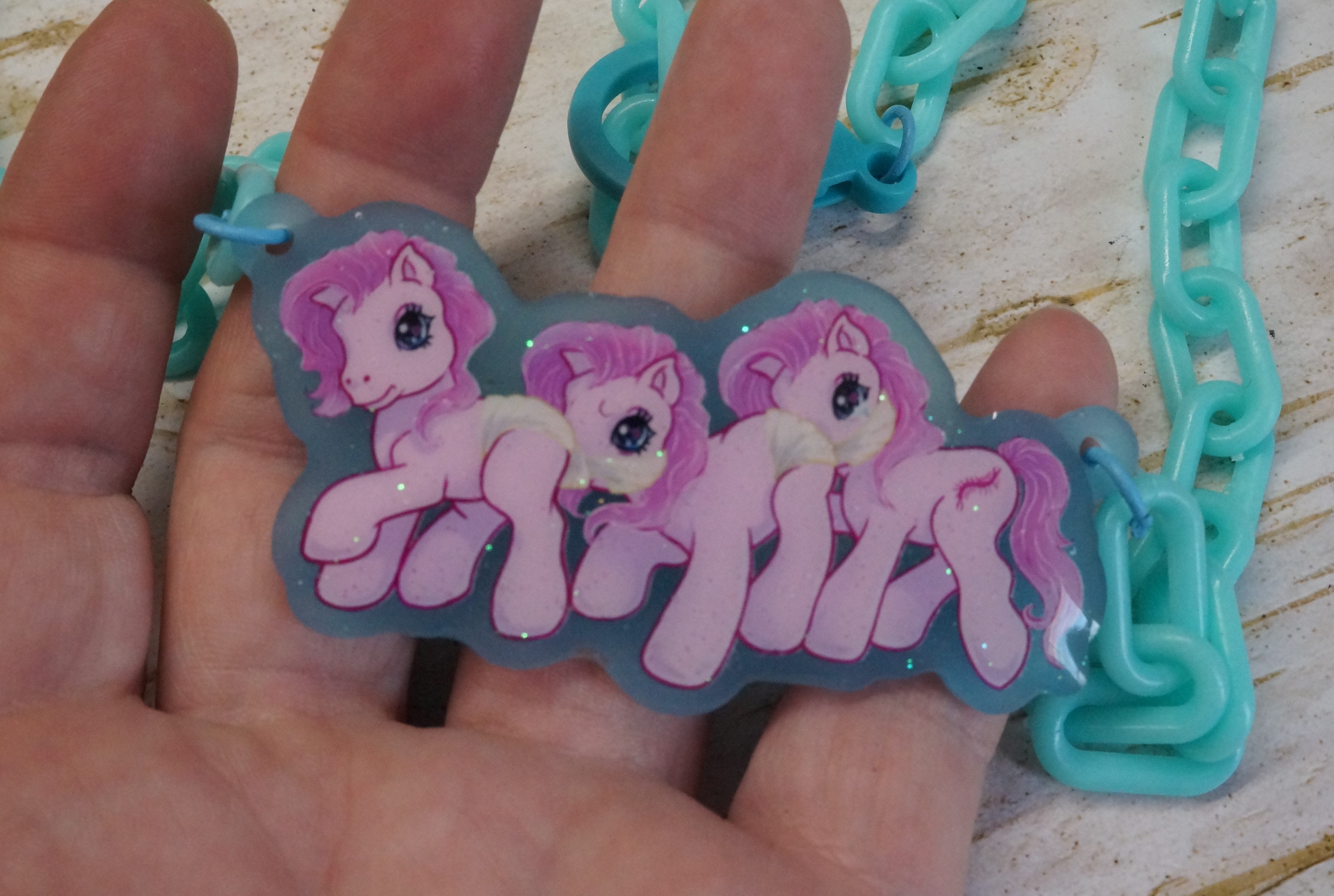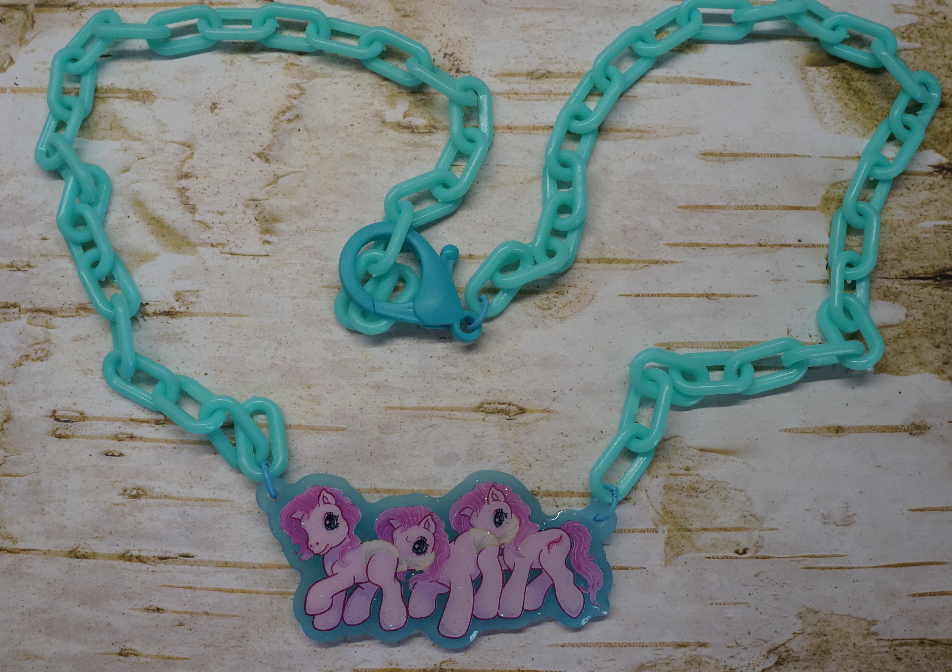 3 inch acrylic charm, single sided with glitter resin over image on a 26 inch blue plastic chain with giant blue, plastic lobster claw clasp 1 size fits most. adjustable.