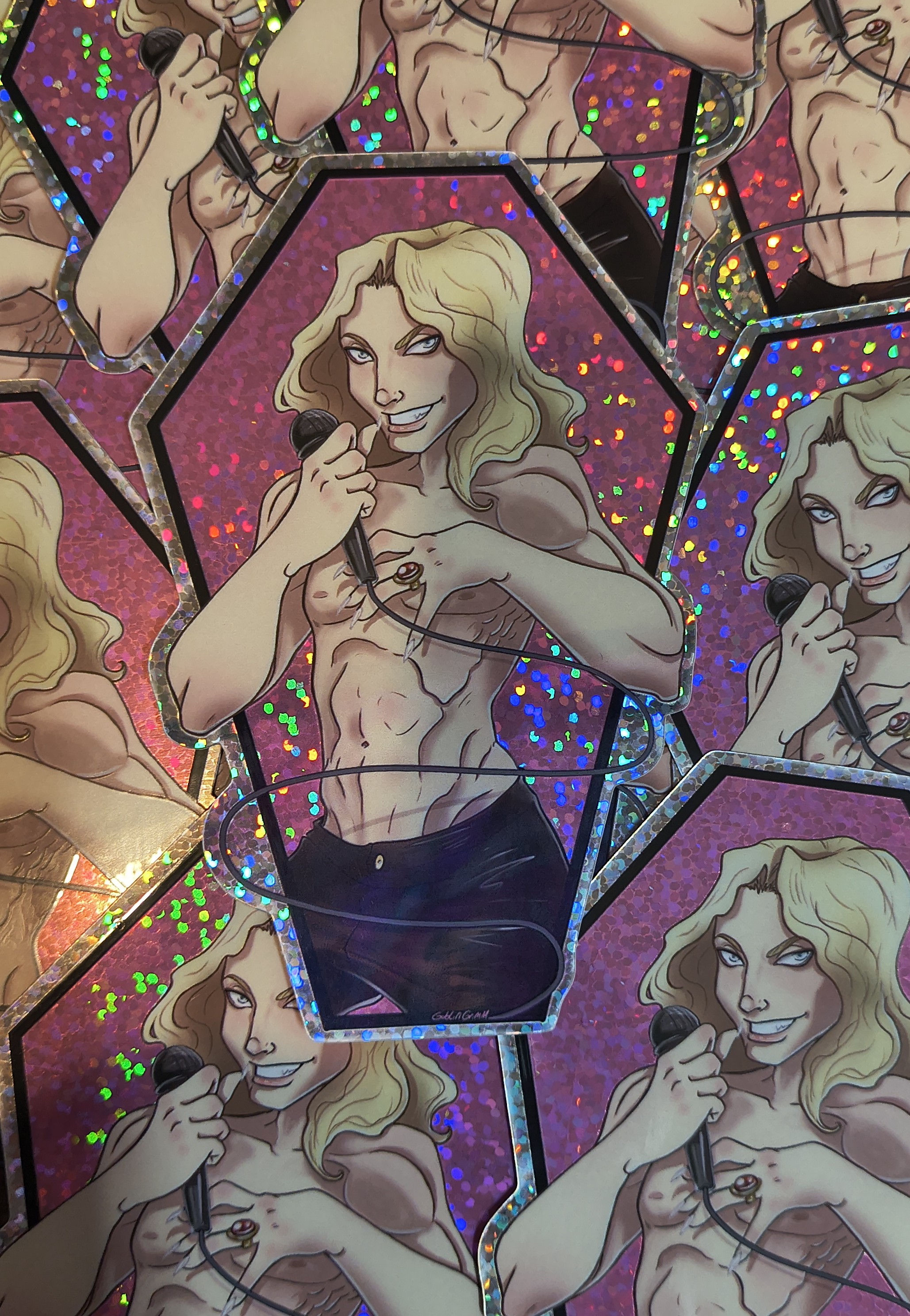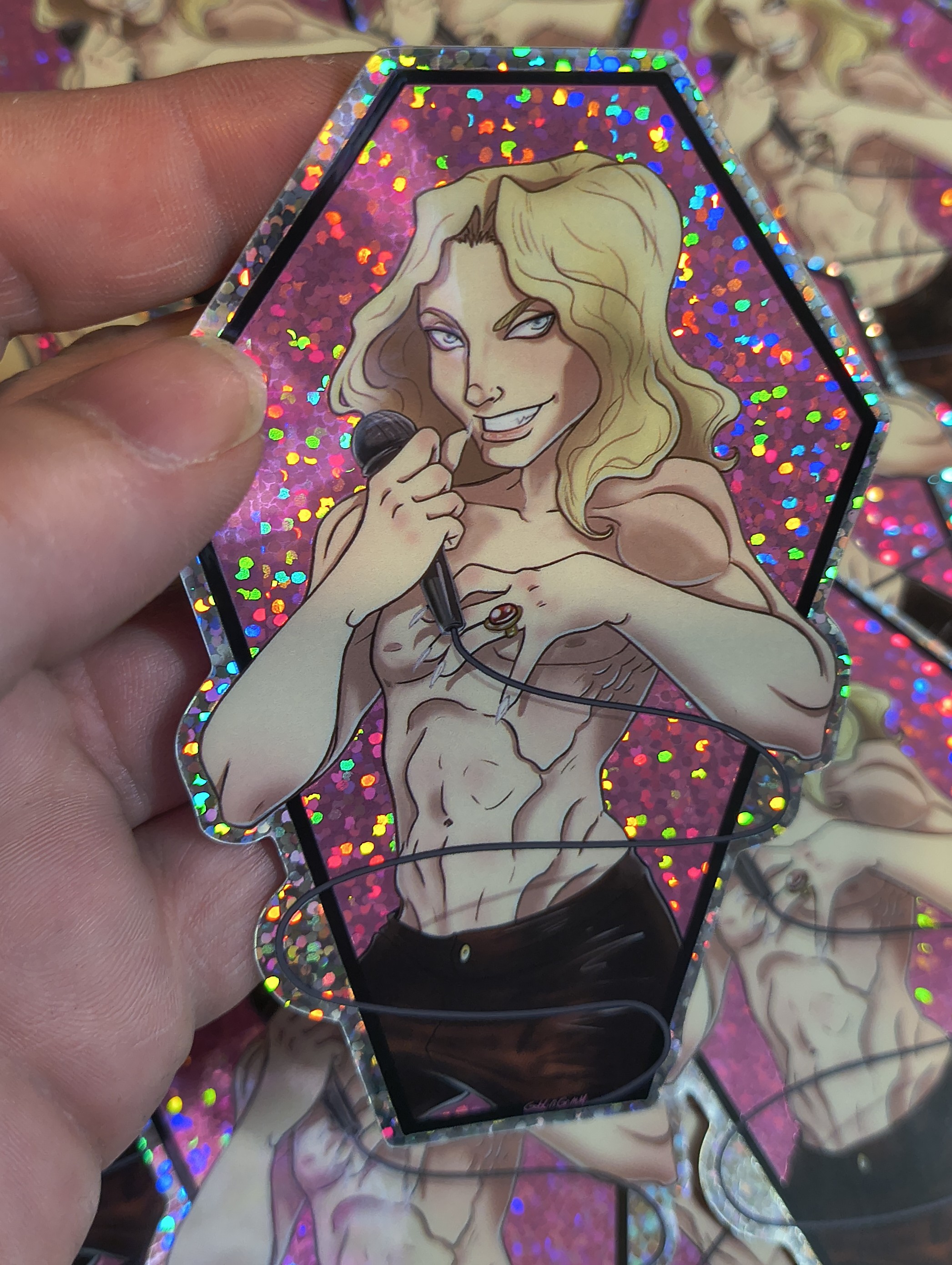 Sticker is 4 inches long, glitter background that sparkles through. This is the only acceptable glittery vampire, thats only because he is all glam rock and added the glitter on to seduce your boyfriend.